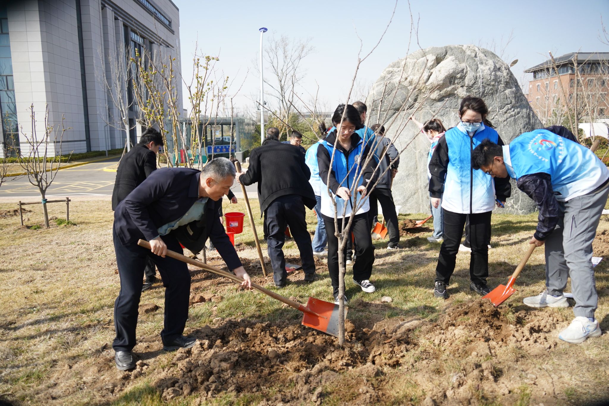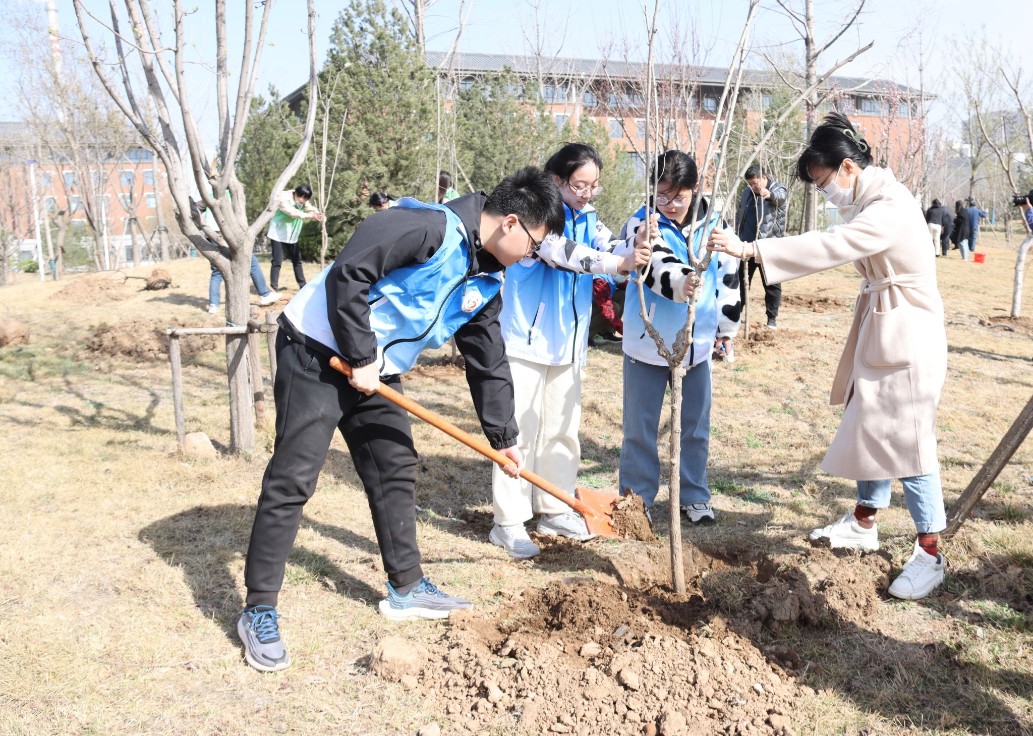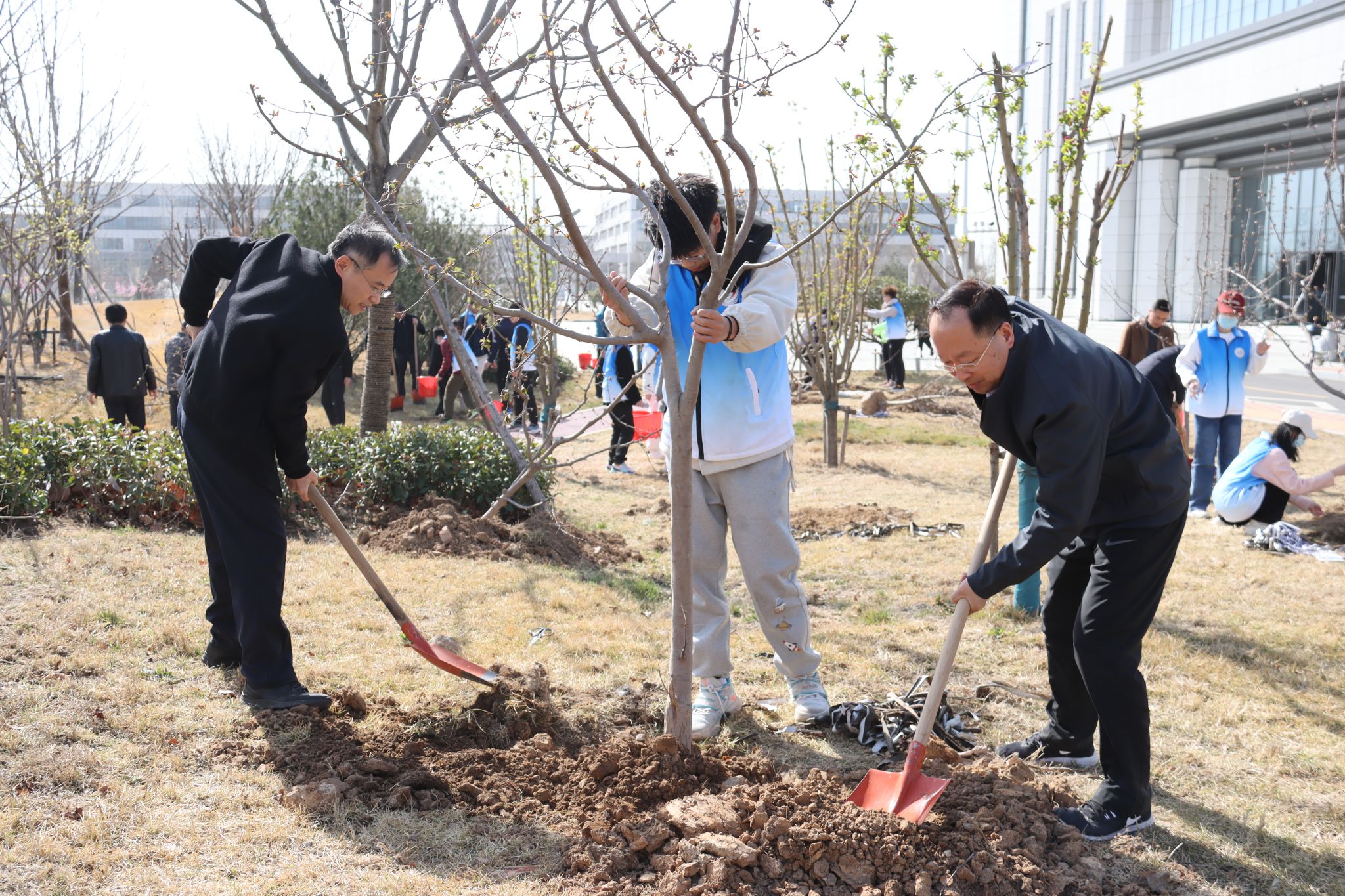 “数树新开翠影齐”,春日山一大,桃李芬芳,争相绽放,生机盎然。泉香湖畔,校(院)领导韩金祥、刘思金、吴向东、刘传勇、李栋、王宇轩、马鲁豫与教职工代表、学生志愿者开展植树活动。