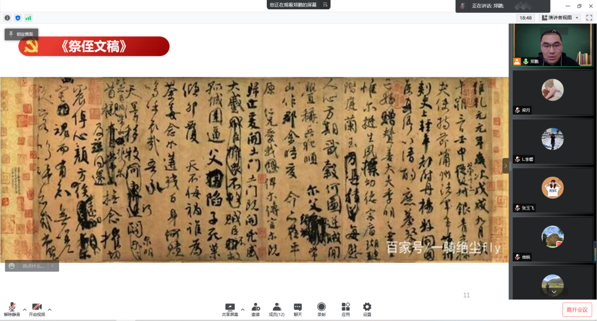 党支部书记以《天地英雄气,千秋尚凛然——清正忠义颜真卿与〈祭侄文稿〉》为题 ,为大家讲授了专题党课。课程以唐代杰出政治家、书法家颜真卿刚正忠烈、坚贞不屈、为国捐躯的英雄事迹以及《祭侄文稿》背后可歌可泣的悲壮故事为切入点,号召全体党员传承中华优秀传统文化,以国家需要为重,以民族大义为念;涵养浩然正气,涵养家国情怀。要始终牢记革命先烈的无私奉献,倍加珍惜今天来之不易的大好局面,崇尚英烈、缅怀英烈、学习英烈、捍卫英烈。