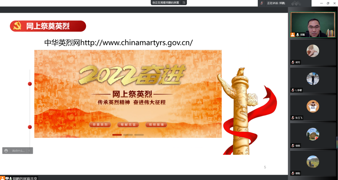 党课中,支部号召党员遵守疫情防控要求,积极开展“云追思,祭英烈”纪念活动,通过中华英烈网“2022奋进--网上祭英烈”平台,在线为英烈献花圈、寄思语,以表达对英烈们的崇高敬意和深切哀思。