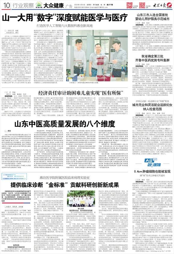 4月6日,《大众日报》健康版头条刊发文章《山一大用“数字”深度赋能医学与医疗》,专题报道我院在“新医科”建设中发挥的支撑和推动作用。全文如下:
