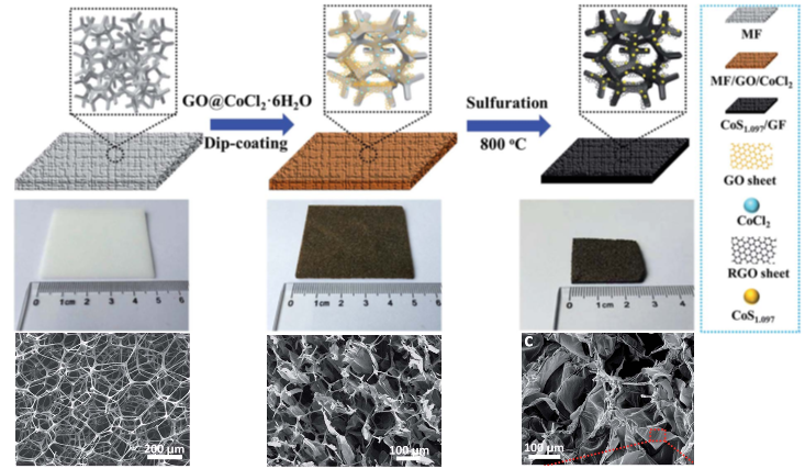 由于对再生资源的迫切需求,氧还原反应(ORR)得到了广泛的研究。寻找高效、低成本的非贵金属催化剂越来越重要。李晨蔚教授团队以三聚氰胺泡沫为模板,采用简单的渗透-干燥-硫化法制备了均匀分布硫化钴纳米颗粒的多孔硫氮共掺杂石墨烯/碳泡沫(Co1-xS/SNG/CF)(如下图)。其中,三聚氰胺泡沫不仅可以作为三维支撑骨架,还可作为没有任何环境污染的氮源。研究发现,Co1-xS/SNG/CF催化剂表现出优异的氧还原催化性能,起始电势仅为0.99 V,与Pt/C催化剂相同(Eonset=0.99 V),且Co1-xS/SNG/CF的稳定性和甲醇容限比Pt/C催化剂更为突出。该项工作提供了一种简便的方法制备Co1-xS纳米颗粒修饰的S和N共掺杂3D石墨烯网络,有望作为价格昂贵的Pt/C催化剂的替代品用于高效氧还原反应中。
