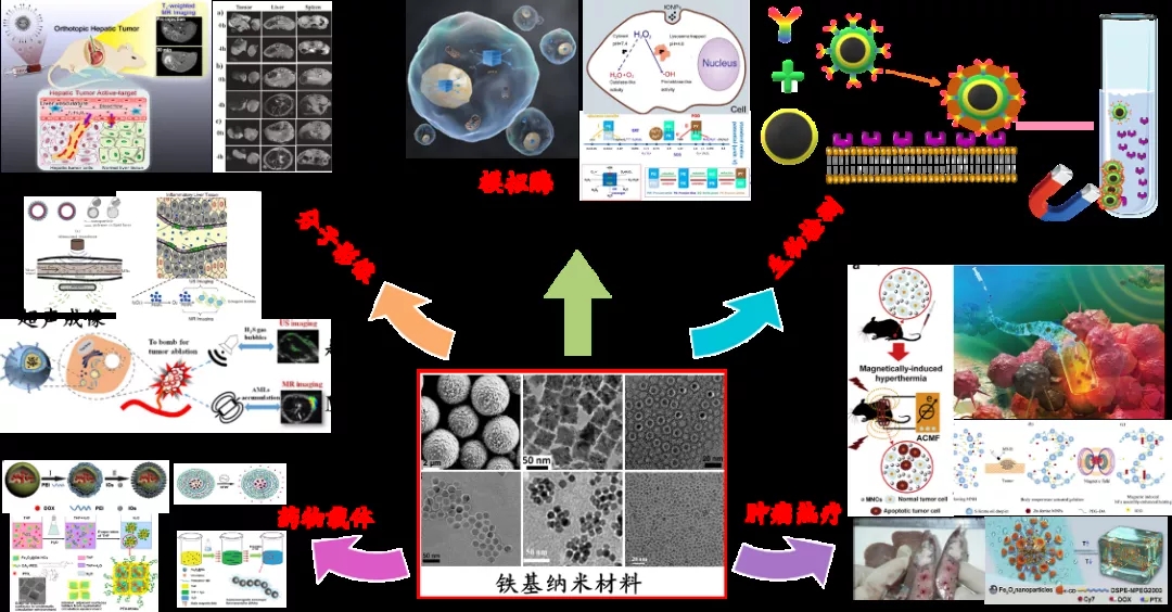 铁基纳米材料是一种重要的过渡金属氧化物的功能性纳米材料,具有合成简单,修饰容易,功能化简便,形貌可控等优势。铁基纳米材料独特的理化性质及良好的生物相容性使其成为生物医学领域中应用最广泛的纳米材料之一,如应用在细胞分选、磁分离免疫检测、MRI造影、磁热疗、药物递送载体、多模态诊断等领域。随着研究的深入,铁基纳米材料越来越多的新的功能和应用潜力被开发出来。比如通过工程设计使纳米颗粒具有一种或多种酶的活性,模拟酶有远超生物酶的体内应用场景。又如铁基纳米材料可以促进间充质干细胞的成骨分化。