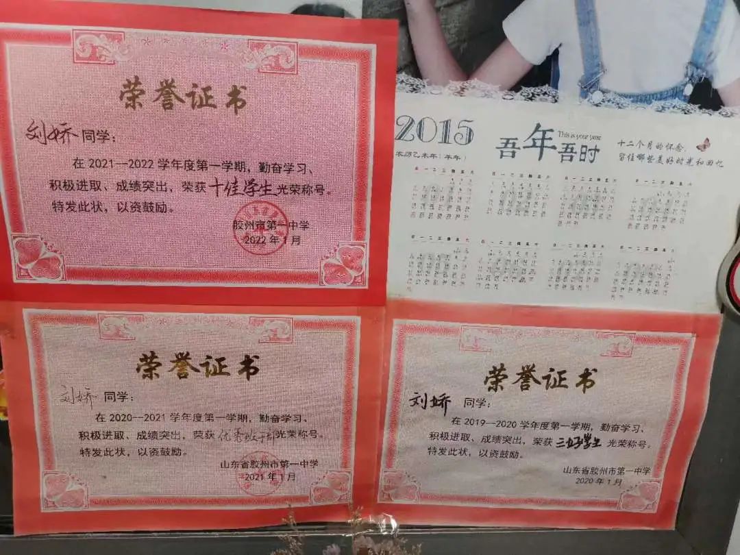 “优秀班干部”、“三好学生”、“十佳少年”……从小到大,刘娇获得的各项荣誉证书、奖牌、奖状,妈妈都细心地收好,有的贴在墙上,有的放在柜子里。这些荣誉见证着她的成长。此外,刘娇还是学校秧歌队主力成员,多次参加学校金秋艺术节,代表学校参加市里的比赛。