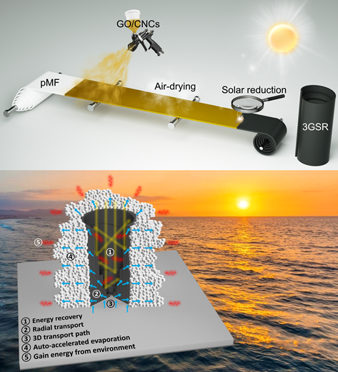 化学与制药工程学院李晨蔚教授和丁美春副教授提出了一种绿色环保的策略,通过太阳光还原和常压干燥技术,成功制备出三维螺旋状石墨烯气凝胶,作为高效太阳能蒸发器。该气凝胶在接近饱和的盐水中表现出卓越的蒸发性能、盐分收集能力以及零液体排放特性。石墨烯气凝胶独特的三维螺旋结构设计不仅优化了能量回收过程,而且促进了盐水的径向输送和盐分的定向结晶。在一个太阳光的照射下,该气凝胶展现出高达9.05 kg m-2h-1的平均蒸发速率。此外,其外表面形成的定向盐结晶显著扩大了蒸发面积,从而实现了2.92 kg m-2h-1的超高盐收集速率。更重要的是,即使在接近饱和(25 wt%)的高浓度盐水条件下,三维螺旋石墨烯气凝胶仍能实现零液体排放脱盐。其可拆卸的外层设计使得盐分收集变得简便高效,使其可以长时间(长达96小时)处理高浓度盐水。在室外测试中,基于三维螺旋石墨烯气凝胶的淡水收集装置表现出创纪录的3.14 kg m-2h-1的产水速率,这充分证明了其在实际应用中的巨大潜力。这项研究不仅展示了一种新颖且环保的制备策略,并为推动高性能和低成本太阳能蒸发器的研发和应用提供了重要的科学依据。