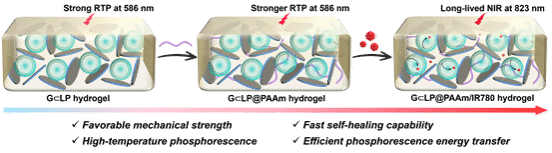 在这项工作中,我们基于非共价超分子层级组装策略,利用两亲性的溴代萘酰亚胺吡啶鎓衍生物(G)、剥离的Laponite纳米片(LP)和聚丙烯酰胺(PAAm)成功在水介质中构筑了高效的近红外磷光超分子水凝胶。两亲性G可以自组装成具有正电荷特征的荧光球形纳米粒子,并在与带负电荷的纳米片的静电相互作用的驱动下,作为交联粘合剂与LP共组装可形成具有红色RTP的超分子水凝胶。此外,受益于氢键相互作用介导的物理交联,聚合物PAAm的引入不仅可使水凝胶具有增强的机械强度和快速自愈能力,而且进一步改善了其磷光性能,特别是在更高的温度下仍然可产生磷光行为。进一步将少量七甲川吲哚类花菁染料作为能量受体掺杂到水凝胶中,通过诱导有效的磷光能量传递过程实现了长寿命的近红外发射,并成功应用于在近红外窗口的细胞标记。总之,通过这种超分子层级组装限域策略构建的超分子水凝胶为制备具有优异磷光性能的先进软材料提供了新的范式,并进一步拓宽了它们在生物医学领域的应用。