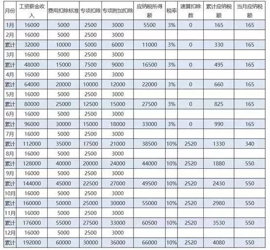 1月应纳税所得额=累计收入-累计免税收入-累计减除费用-累计专项扣除-累计专项附加扣除-累计依法确定的其他扣除=16000-5000-2500-3000=5500元,对应税率为3%。