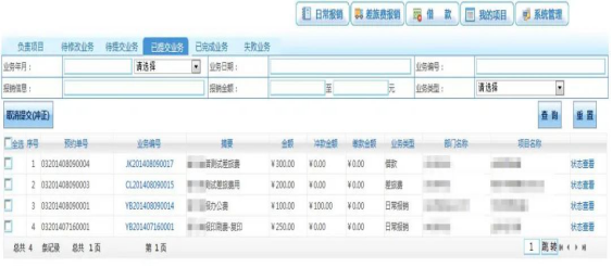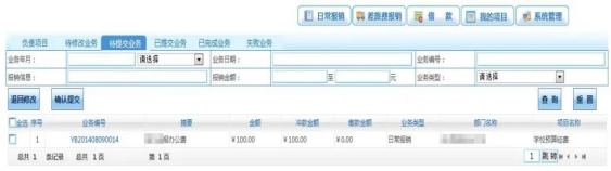 已提交业务是指已经提交、待财务处理的单据,可以打印。单击“已提交业务”链接可以查询当前用户已经提交的报销业务记录,可以在上部录入筛选条件筛选出符合条件的记录,右下角可以进行页面跳转操作。选中一条或多条记录单击“取消提交(冲正)”按钮可以取消提交。单击某一条记录的业务编号列,可以打印单据。