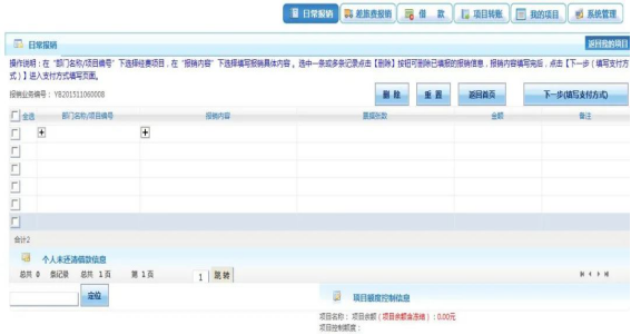 单击部门名称/项目编号列的加号按钮就会拉伸出该人员负责的项目,从中选择一个本次报账的项目。