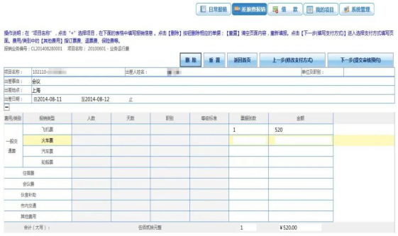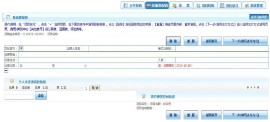 单击顶部“差旅费报销”链接,系统显示差旅费录入界面,系统自动生成一个“报销业务编号”,这是个流水号。