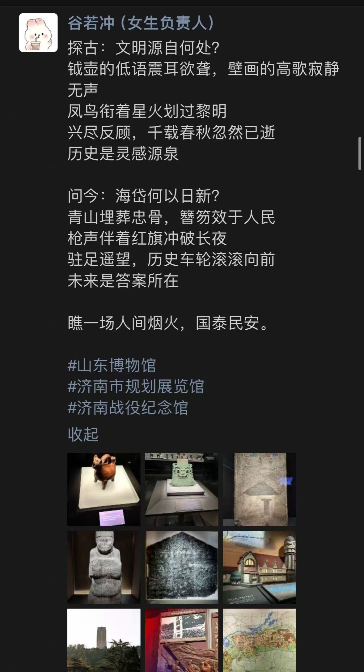 走进山东省博物馆,馆内每一处都承载着厚重的历史和深刻的文化内涵,其中各种丰富的馆藏精品,更是让同学们领略到了中华文化的博大精深,体会到了中华民族的自强不息和中华文化开放包容,激发了对优秀传统文化的热爱之情。