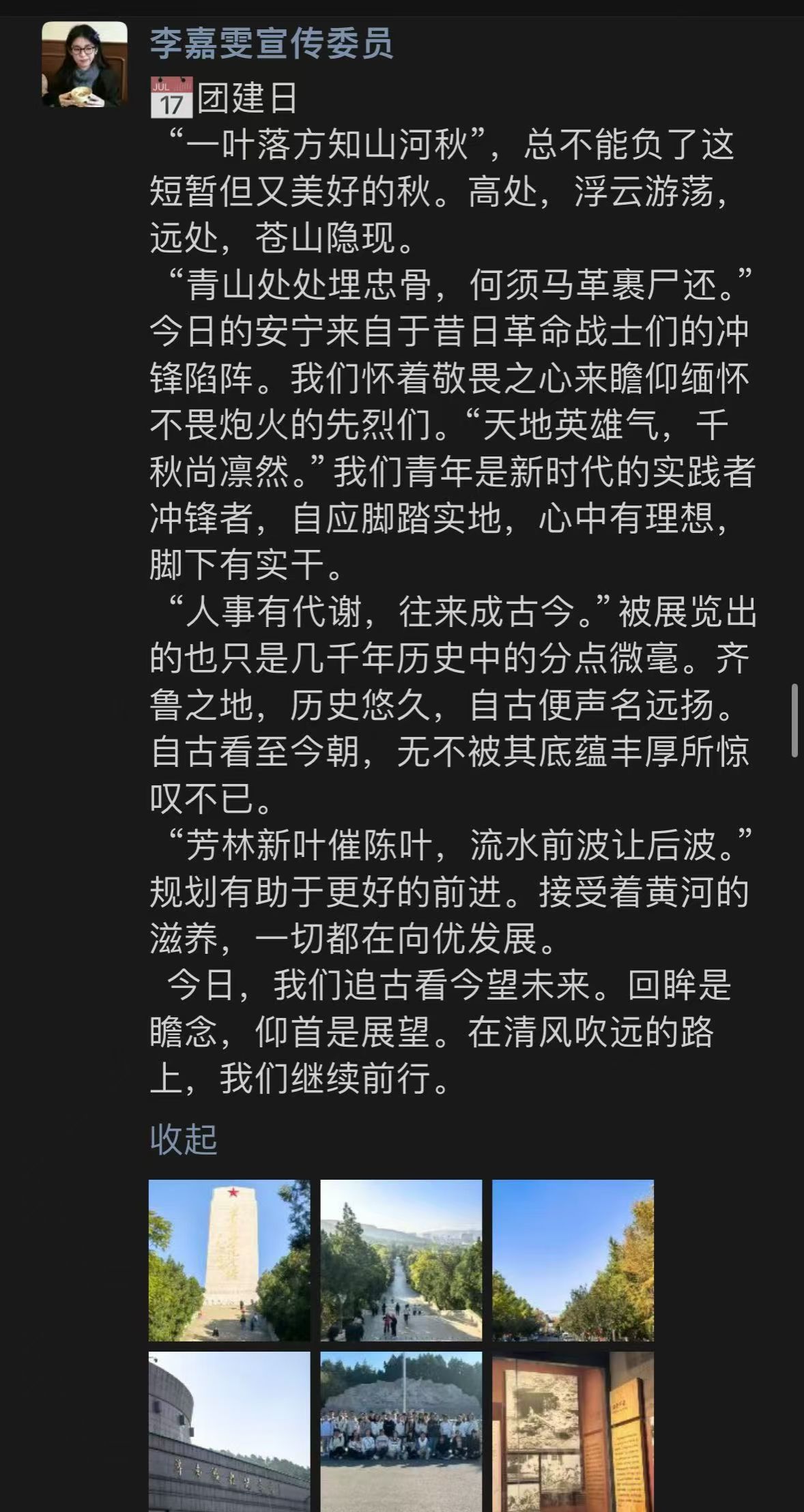 寻红色踪迹,忆峥嵘岁月。在济南市战役纪念馆,同学们跟随讲解员认真参观,全面了解了济南革命战争的光辉历程,无数革命烈士用鲜血和生命,铺就了一条通向和平与繁荣的道路。同学们深深地感受到了革命先烈的伟大斗争精神,坚定了不忘初心、勇往直前的理想信念。