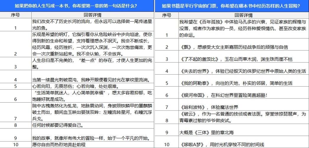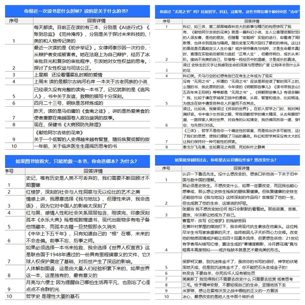 此次答题活动采用线上问卷方式,充满趣味的题目引起了支部党员和同学们的浓厚兴趣,大家积极参与,认真填写,分享了自己最近读过的书籍和对阅读的感悟。答卷精彩纷呈,引人深思。比如问题“如果能穿越回过去,你希望去认识哪位作家?想改变什么?”答卷中有的想认识李白并改变他怀才不遇的境遇,有的想知道《红楼梦》的结局,有的想挽救三毛的生命。再比如问题“如果把你的人生写成一本书,你希望第一章的第一句话是什么?”大部分人都把乐观、积极、自信、勇气这些关键词作为人生之书的开篇,答卷中饱含了大家对人生的感悟、对生命的热爱以及对未来的希望。