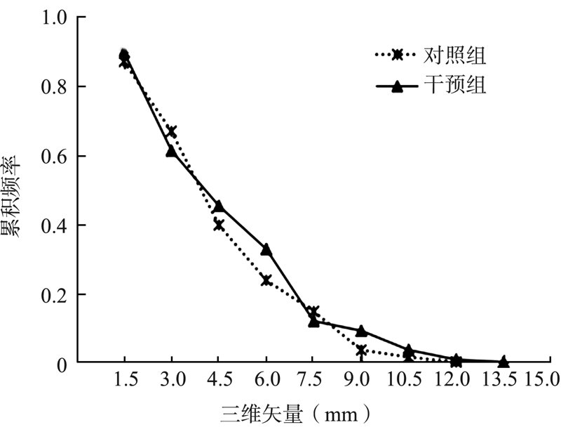 目的研究头颈部肿瘤旋转误差对放疗位置精准性(PA)的影响,评价是否需要矫正旋转误差。方法收集2019年8月至2020年1月武汉大学中南医院肿瘤放疗中心34例头颈部肿瘤患者的图像资料。每例患者放疗前拍摄兆伏级计算机断层扫描(MVCT)图像,采用两种配准方式与计划千伏级计算机断层扫描(KVCT)图像配准,根据不同配准方式分为对照组(平移配准)和干预组(平移和旋转配准),两组各有144次图像配准。记录两种配准方式的位置误差并比较。数据处理采用Wilcoxon符号秩检验和Spearman秩相关分析。结果对照组和干预组左右方向平移误差分别为0.10(5.35)mm和0.00(5.78)mm,差异有统计学意义(Z=-2.675,P=0.007);上下方向分别为0.75(2.78)mm和0.60(2.68)mm,差异有统计学意义(Z=-2.819,P=0.005);前后方向分别为0.10(0.90)mm和0.20(1.28)mm,差异有统计学意义(Z=-3.984,P<0.001)。干预组俯仰角(pitch)、翻滚角(roll)、偏航角(yaw)旋转误差分别为-0.20(0.60)°、0.35(2.00)°和0.00(0.98)°。两组三维矢量矫正频数呈正偏态分布。矫正累积频率(CCF)随三维矢量不同而变化,三维矢量为8.0 mm,对照组和干预组分别有19次和16次分次治疗未矫正;三维矢量在8.0~13.5 mm之间,干预组矫正趋势减缓且延迟矫正全部分次治疗。Spearman秩相关分析显示,pitch旋转误差与对照组上下方向和干预组前后方向平移误差均呈负相关(r=-0.182,P=0.029和r=-0.484,P<0.001);roll旋转误差与干预组左右方向平移误差呈负相关(r=-0.334,P<0.001);yaw旋转误差与对照组上下方向平移误差呈负相关(r=-0.171,P=0.040),yaw旋转误差与干预组左右和上下方向平移误差分别呈正相关(r=0.370,P<0.001)和负相关(r=-0.203,P=0.015);总角度与对照组上下、前后方向平移误差和三维矢量分别呈正相关(r=0.246,P=0.003)、负相关(r=-0.188,P=0.024)和正相关(r=0.198,P=0.017),总角度与干预组上下方向平移误差和三维矢量均呈正相关(r=0.170,P=0.041;r=0.239,P=0.004);其余变量间均无相关性(均P>0.05)。结论尽管矫正旋转增加前后方向平移误差和三维矢量,但可促进头颈部肿瘤放疗PA。旋转矫正受限可通过矫正平移误差补偿,以降低其对PA的影响。