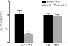 目的探讨miR-1254及其靶基因巨噬细胞集落剌激因子-1(CSF-1)在胶质瘤组织、胶质瘤细胞中的表达,以及miR-1254和CSF-1对胶质瘤细胞增殖和侵袭能力的影响。方法收集2017年4月至2019年5月在湖北省十堰市太和医院接受手术治疗的30例胶质瘤患者的临床病理标本以及癌旁组织,采用实时荧光定量PCR(qRT-PCR)检测胶质瘤组织、癌旁组织以及细胞株U87和人脑正常胶质细胞HEB中miR-1254和CSF-1 mRNA的表达水平。将胶质瘤U87细胞分为空白对照组、mimic NC组、miR-1254 mimic组以及siRNA NC组、CSF-1 siRNA组。采用qRT-PCR检测各组细胞miR-1254及CSF-1的mRNA表达水平;采用Western blotting检测各组细胞CSF-1的蛋白表达水平;采用双荧光素酶报告基因实验验证miR-1254和CSF-1基因的靶向关系;采用CCK-8法和Transwell侵袭实验检测细胞的增殖和侵袭能力。结果胶质瘤组织中miR-1254 mRNA的相对表达量为0.44±0.16,癌旁组织为1.15±0.28,差异具有统计学意义(t=12.914,P<0.001);胶质瘤组织中CSF-1 mRNA的相对表达量为1.96±0.27,癌旁组织为0.98±0.22,差异具有统计学意义(t=14.970,P<0.001)。胶质瘤细胞U87中miR-1254 mRNA的相对表达量为0.39±0.11,人脑正常胶质细胞HEB中为1.03±0.02,差异具有统计学意义(t=10.113,P=0.008);胶质瘤细胞U87中CSF-1 mRNA相对表达量为1.02±0.03,人脑正常胶质细胞HEB为0.32±0.13,差异具有统计学意义(t=9.037,P=0.009)。转染miR-1254后,CSF-1 mRNA、蛋白的表达水平均随miR-1254表达水平的升高而降低。双荧光素酶报告基因实验结果显示,与mimic NC组(1.04±0.12)比较,miR-1254 mimic组(0.31±0.02)CSF-1-WT细胞中荧光活性显著降低(t=10.430,P<0.001)。转染48 h后,空白对照组(0.71±0.01)、mimic NC组(0.68±0.04)、miR-1254 mimic组(0.35±0.01)细胞增殖能力差异具有统计学意义(F=252.651,P<0.001);miR-1254 mimic组与空白对照组相比,差异具有统计学意义(P<0.001);miR-1254 mimic组与mimic NC组相比,差异具有统计学意义(P<0.001)。空白对照组(0.71±0.01)、siRNA NC组(0.68±0.04)、CSF-1 siRNA组(0.25±0.01)细胞增殖能力差异具有统计学意义(F=320.309,P<0.001);CSF-1 siRNA组与空白对照组相比,差异具有统计学意义(P<0.001);CSF-1 siRNA组与siRNA NC组相比,差异具有统计学意义(P<0.001)。侵袭实验结果显示空白对照组(365±27)、mimic NC组(388±24)、miR-1254 mimic组(83±15)细胞穿膜数差异具有统计学意义(F=173.915,P<0.001);空白对照组(365±27)、siRNA NC组(404±32)、CSF-1 siRNA组(87±14)细胞穿膜数差异具有统计学意义(F=141.294,P<0.001)。结论miR-1254在胶质瘤组织和胶质瘤细胞株U87中的表达均显著下降,CSF-1在胶质瘤组织和胶质瘤细胞株U87中的表达均显著升高。过表达miR-1254可能通过靶向降低CSF-1的表达来抑制胶质瘤U87细胞的增殖和侵袭能力。