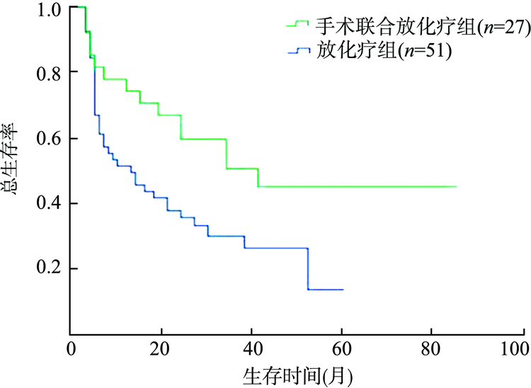 目的比较晚期下咽鳞状细胞癌患者接受手术联合放化疗与放化疗治疗的生存情况及不良反应,并分析患者预后影响因素。方法回顾性分析2013年8月至2018年12月就诊于蚌埠医学院第一附属医院肿瘤放疗科的78例晚期下咽鳞状细胞癌患者的临床病理资料,根据治疗方式将患者分为手术联合放化疗组(n=27)和放化疗组(n=51)。中位随访时间为46(20~84)个月,主要观察指标为总生存期(OS)、无进展生存期(PFS)和局部控制率(LCR),采用Cox回归模型分析患者预后影响因素。结果截至2020年7月31日,78例晚期下咽鳞状细胞癌患者死亡51例,其中局部复发6例、远处转移11例、其他原因34例(包括大出血15例、恶病质15例、其他疾病4例);手术联合放化疗组死亡12例,占手术联合放化疗组的44.44%;放化疗组死亡39例,占放化疗组的76.47%。78例患者的1、3、5年OS率分别为57.7%、36.3%、27.2%,1、2、3年PFS率分别为49.5%、38.7%和32.6%,1、2、3年LCR分别为53.4%、40.0%、34.2%。其中手术联合放化疗组患者1、3、5年OS率分别为74.1%、50.1%、44.6%,放化疗组分别为49.0%、29.3%、12.8%,差异有统计学意义(χ2=5.142,P=0.023);手术联合放化疗组患者1、2、3年PFS率分别为62.1%、54.3%、44.4%,放化疗组分别为43.1%、30.6%、26.7%,差异无统计学意义(χ2=3.222,P=0.073);手术联合放化疗组患者1、2、3年LCR分别为69.8%、54.3%、44.4%,放化疗组分别为45.1%、32.9%、29.6%,差异无统计学意义(χ2=3.576,P=0.059)。单因素分析结果显示,肿瘤T分期(χ2=7.140,P=0.008)、N分期(χ2=4.493,P=0.034)、治疗方式(χ2=5.142,P=0.023)均为晚期下咽鳞状细胞癌患者OS的独立影响因素;T分期(χ2=5.807,P=0.016)和N分期(χ2=6.587,P=0.010)均为晚期下咽鳞状细胞癌患者PFS的独立影响因素。多因素分析结果显示,肿瘤T分期(HR=2.121,95%CI为1.142~3.938,P=0.017)、N分期(HR=2.088,95%CI为1.144~3.811,P=0.016)、治疗方式(HR=0.430,95%CI为0.226~0.815,P=0.010)均为晚期下咽鳞状细胞癌患者OS的独立预后因素;肿瘤T分期(HR=1.884,95%CI为1.011~3.510,P=0.046)、N分期(HR=1.904,95%CI为1.058~3.429,P=0.032)均为晚期下咽鳞状细胞癌患者PFS的独立预后因素。治疗期间手术联合放化疗组与放化疗组患者放射性咽炎[7.41%(2/27)vs.39.22%(20/51),χ2=8.821,P=0.003]和放射性皮炎[3.70%(1/27)vs.29.41%(15/51),χ=7.156,P=0.007]发生率差异均具有统计学意义,两组患者放射性口腔黏膜炎[11.11%(3/27)vs.17.65%(9/51),χ2=0.186,P=0.666]、骨髓抑制[37.04%(10/27)vs.50.98%(26/51),χ2=1.381,P=0.240]、咽部感染[11.11%(3/27)vs.5.88%(3/51),χ2=0.143,P=0.706]及气管瘘[7.41%(2/27)vs.0(0/51),P=0.117]等不良反应发生率比较,差异均无统计学意义。结论手术联合放化疗组患者的1、3、5年OS率高于放化疗组患者,且不良反应发生率低。肿瘤T分期、N分期、治疗方式均为晚期下咽鳞状细胞癌患者OS的独立预后因素,肿瘤T分期、N分期均为晚期下咽鳞状细胞癌患者PFS的独立预后因素。