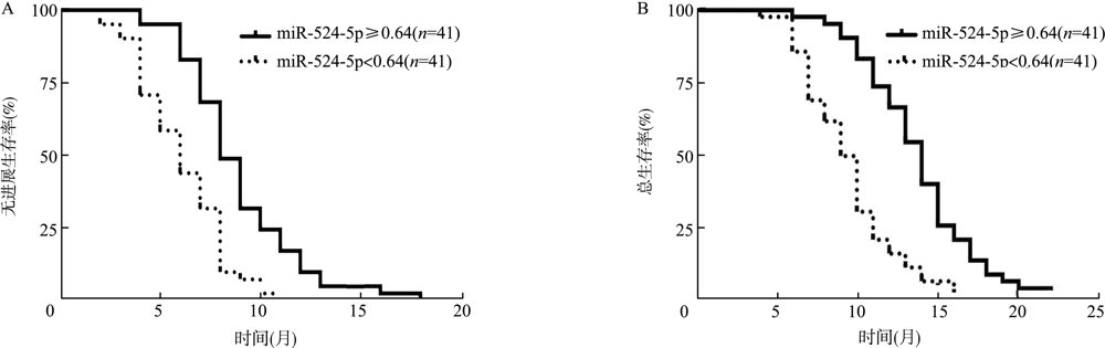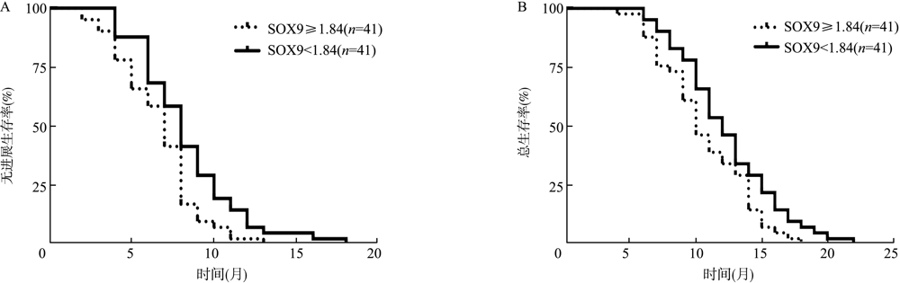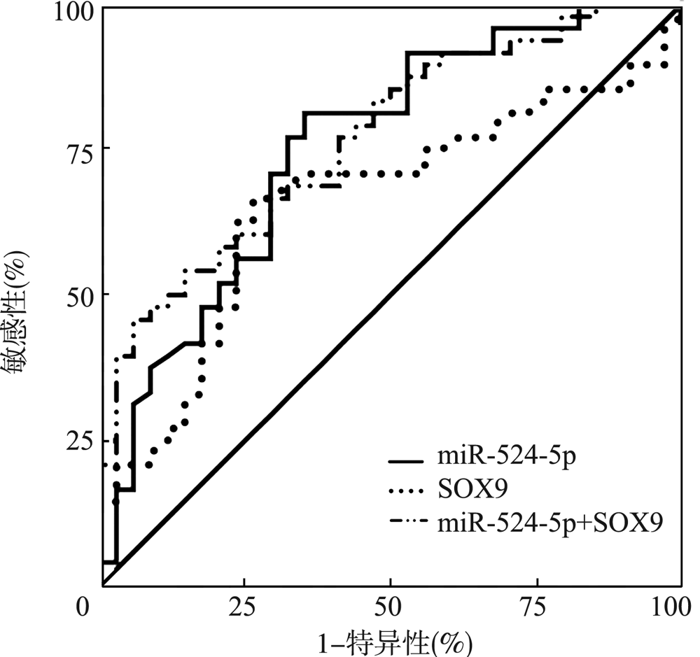 目的研究晚期胃癌中miR-524-5p与性别决定区Y框蛋白9(SOX9)表达的相关性及其对化疗疗效和预后的影响。方法选择2015年1月至2017年12月在中国人民解放军联勤保障部队第九一〇医院诊断为晚期胃癌并接受DCF(多西他赛+顺铂+氟尿嘧啶)方案化疗的82例患者作为研究对象,采用荧光定量PCR法检测胃癌组织中miR-524-5p、SOX9的表达水平,分析miR-524-5p与SOX9表达的相关性,比较不同miR-524-5p、SOX9表达水平患者化疗总有效率,分析miR-524-5p联合SOX9对化疗疗效的预测价值,分析患者的总生存期(OS)及无进展生存期(PFS)。结果miR-524-5p、SOX9的表达与晚期胃癌患者的性别、年龄无关(均P>0.05),与晚期胃癌患者的分化程度(χ2=3.577,P=0.001;χ2=5.654,P<0.001)、远处转移(χ2=2.466,P=0.016;χ2=5.218,P<0.001)有关。晚期胃癌中miR-524-5p与SOX9的表达呈负相关(r=-0.348,P=0.001)。根据胃癌组织miR-524-5p、SOX9表达中位数分为高表达与低表达患者,miR-524-5p≥0.64为高表达(n=41),<0.64为低表达(n=41);SOX9≥1.84为高表达(n=41),<1.84为低表达(n=41)。miR-524-5p高表达晚期胃癌患者的总有效率58.54%(24/41)高于miR-524-5p低表达患者的24.39%(10/41),差异有统计学意义(χ2=9.484,P=0.002);SOX9高表达晚期胃癌患者的总有效率21.95%(9/41),低于SOX9低表达患者的60.98%(25/41),差异有统计学意义(χ2=12.863,P<0.001)。受试者工作特征曲线分析显示,miR-524-5p和SOX9的表达对化疗疗效具有预测价值,曲线下面积分别为0.753(95%CI为0.6440.861,P<0.001)和0.660(95%CI为0.5400.780,P=0.014)。miR-524-5p联合SOX9对化疗疗效具有预测价值,曲线下面积为0.768(95%CI为0.6670.868,P<0.001)。miR-524-5p高表达晚期胃癌患者的中位PFS为8个月,中位OS为14个月,均长于miR-524-5p低表达患者(6个月、9个月),差异均有统计学意义(χ2=21.160,P<0.001;χ2=29.730,P<0.001);SOX9高表达晚期胃癌患者的中位PFS为7个月,中位OS为10个月,均短于SOX9低表达患者(8个月、12个月),差异均有统计学意义(χ2=6.345,P=0.012;χ2=4.107,P=0.043)。结论晚期胃癌组织中miR-524-5p与SOX9的表达呈负相关,miR-524-5p高表达、SOX9低表达的患者化疗疗效及预后均优于miR-524-5p低表达、SOX9高表达的患者。