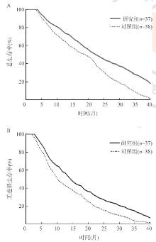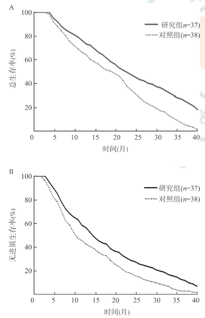 摘要: 目的 探讨射频消融(RFA)后辅助改良FOLFOX6(mFOLFOX6,奥沙利铂+亚叶酸钙+5-氟尿嘧啶)联合贝伐珠单抗方案在KRAS、BRAF V600E突变型结直肠癌术后不可手术切除肝转移患者的疗效及不良反应。 方法 选取2016年1月至2020年6月山西省肿瘤医院确诊的KRAS、BRAF V600E突变型结直肠癌肝转移(CRLM)患者作为研究对象,按照随机数字表法分为对照组和研究组,每组40例;对照组患者给予mFOLFOX6联合贝伐珠单抗治疗,14 d为一个周期,共6个周期;研究组患者给予RFA治疗后mFOLFOX6联合贝伐珠单抗方案治疗。对照组患者治疗过程中1例因发生4级中性粒细胞减少、1例4级胃肠反应退出研究;研究组患者2例因发生4级中性粒细胞减少、1例4级肝功能异常退出临床研究。比较两组患者近期疗效、中位总生存期(OS)、中位无进展生存期(PFS)、血清肿瘤标志物CEA、CA199水平变化及不良反应发生情况。 结果 研究组客观缓解率(ORR)、疾病控制率(DCR)分别为54.05%(20/37)、83.78%(31/37),高于对照组的28.95%(11/38)、60.53%(23/38),差异均具有统计学意义(χ 2=4.873,P=0.027;χ 2=5.030,P=0.025)。研究组患者中位OS、中位PFS分别为23.5个月、14.6个月,长于对照组的19.2个月、10.5个月,差异均具有统计学意义(χ 2=7.863,P=0.015;χ 2=7.016,P=0.019)。研究组患者治疗后血清肿瘤标志物CEA、CA199分别为(4.6±1.1)ng/ml、(35.6±5.3)U/ml,低于对照组的(9.5±1.5)ng/ml、(46.6±6.2)U/ml,差异均具有统计学意义(t=8.532,P=0.016;t=7.561,P=0.023)。研究组患者的骨髓抑制、胃肠反应、感染、出血、乏力发生率分别为56.76%(21/37)、75.68%(28/37)、5.41%(2/37)、8.11%(3/37)、51.35%(19/37),对照组分别为50.00%(19/38)、65.79%(25/38)、2.63%(1/38)、2.63%(1/38)、42.11%(16/38),差异均无统计学意义(χ 2=0.344,P=0.558;χ 2=0.884,P=0.347;χ 2=0.001,P=0.981;χ 2=0.293,P=0.588;χ 2=0.644,P=0.422);研究组患者肝功能异常发生率为35.14%(13/37),高于对照组的13.16%(5/38),差异具有统计学意义(χ 2=4.964,P=0.026)。 结论 RFA后辅助mFOLFOX6联合贝伐珠单抗在KRAS、BRAF V600E突变型结直肠癌术后不可手术切除肝转移患者中疗效确切,可有效延长生存期,不良反应可控、可耐受。