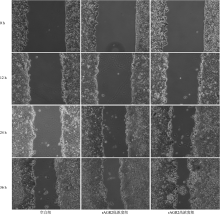 目的检测3种结肠癌细胞株SW480、SW620和COLO205培养液中前梯度蛋白2(AGR2)的表达情况,并探讨不同浓度外源性AGR2对SW620细胞增殖、迁移和侵袭能力的影响。方法采用蛋白质印迹法检测结肠癌细胞SW480、SW620和COLO205培养液中AGR2蛋白表达水平。将SW620细胞分为空白对照组、前梯度蛋白2同源人重组蛋白(rAGR2)低浓度组(100 μg/ml)和rAGR2高浓度组(200 μg/ml),采用CCK-8实验、细胞划痕实验、Transwell迁移和侵袭实验检测不同浓度rAGR2对SW620细胞生物学行为的影响。结果蛋白质印迹法检测结果显示,SW480、SW620、COLO205细胞AGR2蛋白表达水平分别为0.545±0.097、0.662±0.040、0.882±0.156,差异有统计学意义(F=7.46,P=0.024),COLO205细胞株AGR2蛋白水平明显高于SW480、SW620细胞株(P=0.009;P=0.047)。CCK-8实验结果显示,空白对照组、rAGR2低浓度组、rAGR2高浓度组SW620细胞增殖活性分别为0.422±0.031、0.542±0.040、0.574±0.033,差异有统计学意义(F=26.35,P<0.001),rAGR2低浓度组、rAGR2高浓度组明显高于空白对照组(均P<0.001)。细胞划痕实验结果显示,3组细胞36 h细胞划痕面积百分比分别为(28.029±2.107)%、(20.642±0.983)%、(16.951±1.608)%,差异有统计学意义(F=35.85,P<0.001),rAGR2低浓度组高于空白对照组(P=0.001),rAGR2高浓度组高于rAGR2低浓度组(P=0.032)。细胞迁移实验结果显示,3组细胞迁移数分别为(447.1±32.3)个、(513.1±55.8)个、(632.4±50.3)个,差异有统计学意义(F=35.62,P<0.001),rAGR2低浓度组多于空白对照组(P=0.007),rAGR2高浓度组多于rAGR2低浓度组(P<0.001)。侵袭实验结果显示,3组细胞侵袭数分别为(369.1±56.1)个、(505.1±34.4)个、(579.0±71.5)个,差异有统计学意义(F=32.40,P<0.001),rAGR2低浓度组多于空白对照组(P<0.001),rAGR2高浓度组多于rAGR2低浓度组(P=0.010)。结论不同侵袭性结肠癌细胞的细胞外液中AGR2蛋白表达量不同,随着侵袭能力的增高,AGR2蛋白的表达也增高。AGR2蛋白可提高结肠癌细胞SW620增殖、迁移和侵袭能力。