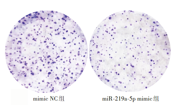 目的 研究miR-219a-5p通过调控高迁移率蛋白A2(HMGA2)对骨肉瘤U2OS细胞增殖、侵袭和迁移的影响。方法 采用实时定量PCR检测骨肉瘤U2OS细胞和正常成骨细胞hFOB1.19的miR-219a-5p mRNA表达水平。采用脂质体转染法将miR-219a-5p模拟物miR-219a-5p mimic(miR-219a-5p mimic组)以及阴性对照mimic NC(mimic NC组)转染U2OS细胞,通过实时定量PCR检测转染后细胞miR-219a-5p和HMGA2 mRNA的表达水平,蛋白质印迹法检测HMGA2蛋白水平,采用CCK-8法和克隆形成实验检测细胞增殖能力、划痕实验检测细胞迁移能力、Transwell小室侵袭实验检测细胞侵袭能力,利用双荧光素酶报告基因实验验证miR-219a-5p与HMGA2间的作用关系。结果 实时定量PCR结果显示,骨肉瘤U2OS细胞中的miR-219a-5p表达水平(0.11±0.01)显著低于正常成骨细胞(1.00±0.06),差异具有统计学意义(t=26.83,P<0.001)。CCK-8法结果显示,mimic NC组和miR-219a-5p mimic组培养24 h后细胞吸光度值分别为0.52±0.02、0.42±0.02,48 h后分别为0.85±0.03、0.60±0.03,72 h后分别为1.12±0.02、0.72±0.02,miR-219a-5p mimic组细胞增殖活性显著低于mimic NC组,差异均具有统计学意义(t=6.97,P<0.001;t=16.65,P<0.001;t=26.78,P<0.001)。克隆形成实验结果显示,miR-219a-5p mimic组细胞克隆数为(157.00±15.39)个,明显低于mimic NC组的(294.00±15.51)个,差异具有统计学意义(t=9.70,P<0.001)。划痕实验结果显示,培养24 h后,miR-219a-5p mimic组细胞划痕面积百分比为(40.53±2.92)%,显著高于mimic NC组的(21.71±3.11)%,差异具有统计学意义(t=7.26,P=0.002)。Transwell小室侵袭实验结果显示,miR-219a-5p mimic组细胞的穿膜数量为(128.67±18.67)个,显著少于mimic NC组的(317.67±14.33)个,差异具有统计学意义(t=15.65,P<0.001)。双荧光素酶报告基因实验结果显示,在含有MUT-HMGA2细胞中,与mimic NC组(4.40±0.28)相比,转染miR-219a-5p mimic(4.30±0.26)对荧光素酶活性无明显影响,差异无统计学意义(t=0.85,P=0.690)。在含有WT-HMGA2细胞中,相比于NC mimic组(4.50±0.25),miR-219a-5p mimic组(2.88±0.16)荧光素酶活性显著降低,差异具有统计学意义(t=19.15,P<0.001)。且过表达miR-219a-5p后,骨肉瘤U2OS细胞中的HMGA2 mRNA和蛋白表达(0.77±0.01;0.37±0.01)相比于mimic NC组(1.00±0.02;1.00±0.01)均下调,差异均具有统计学意义(t=16.38,P<0.001;t=42.02,P<0.001)。结论 在骨肉瘤细胞中,miR-219a-5p可通过下调HMGA2的表达抑制骨肉瘤细胞的增殖、迁移和侵袭。