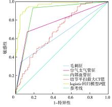 目的构建恶性肺纯磨玻璃结节(pGGN)患者基于CT影像学特征的病理分型预测模型并分析其预测效能。方法回顾性纳入2018年1月—2022年12月于三二〇一医院行手术治疗并具有病理组织学检查结果的肺pGGN患者193例217个病灶,根据是否为浸润性腺癌划分为浸润性腺癌组(68例患者,73个病灶)和非浸润性腺癌组(125例患者,144个病灶);比较两组患者的临床特征资料及CT影像学参数指标;采用logistic多因素回归分析恶性肺pGGN确诊为浸润性腺癌的危险因素;构建恶性肺pGGN病理分型logistic预测模型并利用受试者操作特征(ROC)曲线分析其预测效能。结果浸润性腺癌组与非浸润性腺癌组毛刺征比例分别为34.25%(25/73)和5.56%(8/144);内部血管征比例分别为93.15%(68/73)和18.75%(27/144);空气支气管征分别为67.12%(49/73)和12.50%(18/144),差异均有统计学意义(χ2=30.93,P<0.001;χ2=108.95,P<0.001;χ2=67.72,P<0.001);浸润性腺癌组结节平扫最大CT值(-527.82±72.95)HU显著高于非浸润性腺癌组(-592.79±86.47)HU,差异有统计学意义(t=-5.50,P<0.001)。多因素分析结果显示,毛刺征(OR=8.93,95%CI为1.99~39.97,P=0.004)、空气支气管征(OR=8.16,95%CI为2.91~22.86,P<0.001)、内部血管征(OR=48.39,95%CI为14.81~158.07,P<0.001)、平扫最大CT值(OR=1.01,95%CI为1.00~1.02,P=0.001)均是恶性肺pGGN确诊为浸润性腺癌的独立影响因素。ROC曲线分析显示,利用毛刺征、空气支气管征、内部血管征、平扫最大CT值、logistic回归模型P值对于恶性肺pGGN病理分型情况进行预测,最佳截断值分别为0.50、0.50、0.50、-547.23 HU、0.46,曲线下面积分别为0.64、0.77、0.87、0.69、0.96,敏感性分别为34.25%、67.12%、93.15%、82.19%、89.04%,特异性分别为94.44%、87.50%、81.25%、46.53%、92.36%,约登指数分别为28.69%、54.62%、74.40%、28.72%、81.40%。结论恶性肺pGGN患者中合并毛刺征、空气支气管征、内部血管征及平扫最大CT值较大者确诊为浸润性腺癌的风险较高;基于毛刺征、空气支气管征、内部血管征及平扫最大CT值构建的预测模型在辅助恶性肺pGGN病理分型鉴别诊断中显示出良好的预测效能。