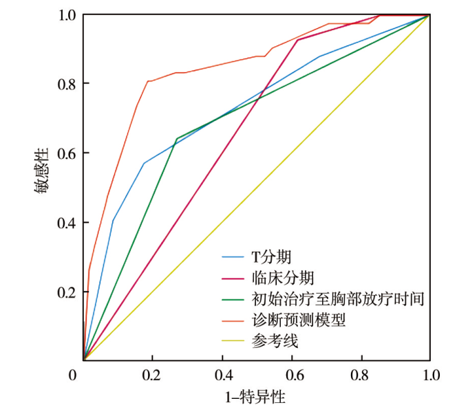 目的探讨接受预防性脑部放疗局限期小细胞肺癌(SCLC)患者缓解后脑转移发生的危险因素并构建预测模型。方法选择2015年1月至2023年1月于三二〇一医院接受放化疗且达到缓解的231例局限期SCLC患者为研究对象。采用logistic回归分析接受预防性脑部放疗局限期SCLC患者缓解后脑转移发生的影响因素,并采用二元logistic回归构建预测模型,受试者操作特征(ROC)曲线评价各项指标及预测模型对患者发生脑转移的诊断效能。结果全组患者中位随访时长73个月,发生脑转移42例,发生率为18.18%。不同T分期(Z=-4.97,P<0.001)、临床分期(Z=-8.17,P<0.001)、初始治疗至胸部放疗时间(χ2=21.38,P<0.001)的患者脑转移发生率比较差异均有统计学意义。多因素分析显示,T分期(T3期:OR=6.29,95%CI为1.58~25.06,P=0.009;T4期:OR=12.91,95%CI为3.74~44.57,P<0.001)、临床分期(Ⅱ期:OR=8.75,95%CI为2.89~26.51,P<0.001;Ⅲ期:OR=18.43,95%CI为7.24~46.92,P<0.001)、初始治疗至胸部放疗时间(OR=0.25,95%CI为0.11~0.56,P=0.001)均是接受预防性脑部放疗局限期SCLC患者缓解后脑转移发生的独立影响因素。基于上述指标建立的诊断预测模型为logit(P)=-19.91+1.84×T3期+2.56×T4期+2.17×Ⅱ期+2.91×Ⅲ期-1.38×初始治疗至胸部放疗时间。ROC曲线分析显示,T分期、临床分期、初始治疗至胸部放疗时间、诊断预测模型预测接受预防性脑部放疗局限期SCLC患者缓解后发生脑转移的曲线下面积分别为0.728、0.660、0.687、0.846,诊断预测模型的曲线下面积明显大于其他指标(均P<0.05)。结论T分期、临床分期及初始治疗至胸部放疗时间均为接受预防性脑部放疗局限期SCLC患者缓解后脑转移发生的影响因素;基于以上指标构建的诊断预测模型有助于指导临床医生早期准确筛选脑转移高危人群。