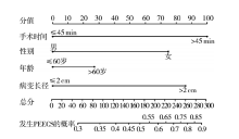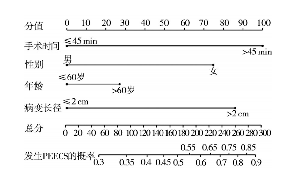 目的分析食管肿瘤内镜黏膜下剥离术(ESD)后电凝综合征(PEECS)发生的影响因素,基于此构建列线图预测模型并进行验证。方法选取2018年10月至2024年5月于西安医学院第一附属医院、陕西省渭南市华州区人民医院和陕西省城固县医院收集的240例行食管肿瘤ESD的患者作为研究对象,采用R软件中“caret”包的“createDataPartition”按照7:3的比例将患者分为建模组和验证组,采用单因素及多因素logistic回归分析建模组食管肿瘤PEECS发生的相关因素并构建列线图预测模型,采用一致性指数(C-index)和校正曲线对预测模型进行验证。结果建模组(n=168)和验证组(n=72)所有资料均具有可比性。单因素分析显示,性别(OR=2.15,95%CI为1.38~3.76,P=0.004)、年龄(OR=2.53,95%CI为1.39~4.61,P=0.001)、手术时间(OR=5.88,95%CI为2.15~8.41,P<0.001)和病变长径(OR=5.16,95%CI为1.85~7.33,P<0.001)均是食管肿瘤PEECS发生的影响因素。多因素分析显示,性别(OR=2.94,95%CI为1.46~5.33,P=0.011)、年龄(OR=2.12,95%CI为1.20~3.88,P=0.042)、手术时间(OR=4.62,95%CI为2.11~7.26,P<0.001)和病变长径(OR=3.93,95%CI为1.78~5.94,P=0.003)均是食管肿瘤PEECS发生的独立影响因素。基于上述指标构建食管肿瘤发生PEECS的列线图预测模型,其C-index值为0.787(95%CI为0.692~0.863)。校准曲线显示,建模组作为内部验证,验证组作为外部验证,预测概率与实际发生概率均具有较好的一致性。结论性别、年龄、手术时间和病变长径均是食管肿瘤PEECS发生的独立影响因素,基于上述指标构建的列线图预测模型具有较高的预测效能。