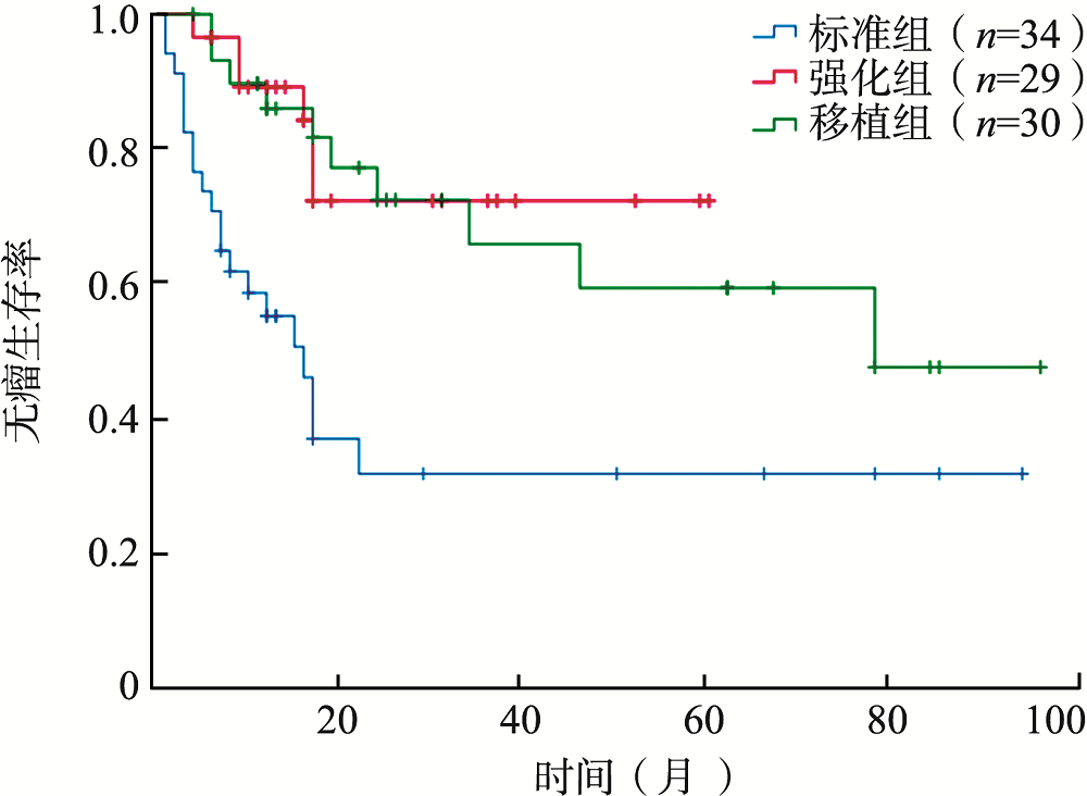 目的分析成人急性淋巴细胞白血病(ALL)患者诱导治疗完全缓解后接受不同巩固治疗方案的生存情况及预后影响因素。方法纳入北京大学深圳医院2012年1月至2019年6月收治的93例成人ALL患者,所有患者经VDLCP方案诱导治疗达完全缓解,根据巩固治疗方案分为标准组、强化组及移植组。标准组34例,接受VDLCP或Hyper-CVAD方案为基础的ALL样方案巩固4~6个疗程;强化组29例,接受BFM90/95方案巩固维持治疗2年;移植组30例,经原诱导方案巩固2~3疗程,接受异基因造血干细胞移植(allo-HSCT)。中位随访时间18(3~96)个月,主要随访指标为总生存期(OS)及无瘤生存期(DFS)。分析成人ALL患者的预后影响因素及各组治疗相关死亡情况。结果标准组、强化组和移植组3年OS率分别为54.0%(95%CI为35.3%~72.6%)、71.8%(95%CI为41.0%~94.5%)、62.3%(95%CI为43.6%~80.9%),差异有统计学意义(χ2=6.110,P=0.047);3年DFS率分别为31.4%(95%CI为12.9%~49.8%)、72.1%(95%CI为52.3%~91.9%)、65.7%(95%CI为45.3%~86.1%),差异有统计学意义(χ2=13.831,P=0.001);强化组和移植组OS及DFS差异均无统计学意义(χ2=0.709,P=0.400;χ2=0.046,P=0.830),强化组OS及DFS显著优于标准组(χ2=5.346,P=0.021;χ2=10.326,P=0.010)。多因素分析提示化疗第14~21天骨髓微小残留病(MRD)转阴为影响成人ALL的独立预后因素(HR=0.114,95%CI为0.015~0.841,P=0.033)。接受与未接受allo-HSCT的Ph+ALL患者3年OS率分别为53.5%(95%CI为23.1%~83.8%)、52.4%(95%CI为23.8%~81.0%),3年DFS率分别为77.1%(95%CI为54.2%~100.0%)、35.0%(95%CI为4.8%~65.2%),两组比较差异均无统计学意义(χ2=3.600,P=0.223;χ2=3.824,P=0.050)。非移植组(标准组+强化组)和移植组治疗相关死亡率分别为3.2%(2/63)、20.0%(6/30),非移植组治疗相关死亡率明显低于移植组(χ2=7.318,P=0.007)。结论成人ALL预后差,采用BFM方案强化巩固治疗3年OS率、3年DFS率均优于标准巩固治疗,达到了与allo-HSCT相似的疗效,而治疗相关死亡率没有显著升高。化疗第14~21天骨髓MRD转阴患者OS、DFS更优。