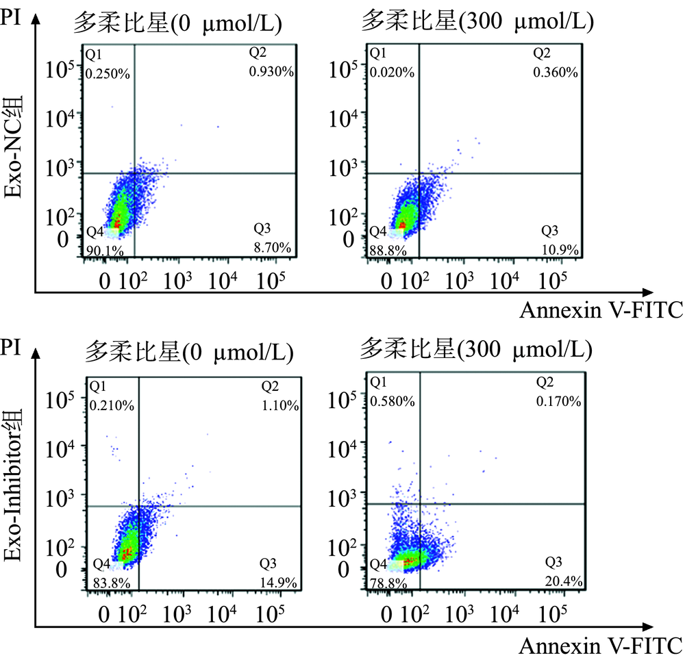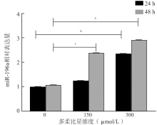 目的筛选肝癌干细胞来源外泌体中差异表达的miRNA并分析其对肝癌细胞恶性生物学特征的影响。方法采用miRNA表达谱芯片分析肝癌干细胞来源外泌体中差异表达的miRNA并鉴定miRNA对肝癌干细胞恶性表型的作用。采用不同浓度(0、150、300 μmol/L)多柔比星处理细胞,采用实时定量PCR(qRT-PCR)检测miR-196a表达水平的变化;分别采用肝癌干细胞来源外泌体(Exo-NC组)、转染miR-196a抑制剂处理后的外泌体(Exo-Inhibitor组)培养肝癌细胞,检测肝癌细胞的凋亡情况以及caspase3/7的活性。按照随机数字表法将裸鼠分为Do-PBS组、Do-Exo-Inhibitor组、Do-Exo-NC组,每组各5只,采用裸鼠移植瘤实验分析miR-196a对肝癌细胞裸鼠移植瘤模型的作用。结果本研究分离纯化了CD133+Huh7干细胞培养上清中的外泌体,发现miR-7162-3p、miR-1910-5p、miR-3613-3p、miR-196a、miR-155-5p表达上调,miR-1246和miR-3613-5p表达下调。外泌体中miR-7162-3p、miR-196a和miR-155-5p对肝癌干细胞的自我更新能力具有重要影响;miR-1910-5p、miR-196a和miR-155-5p对肝癌干细胞的侵袭能力具有重要影响,其中miR-196a的抑制效果最显著。在反应24 h时,多柔比星浓度在0、150、300 μmol/L时miR-196a的表达量分别为0.96±0.05、1.23±0.05和2.33±0.03,差异具有统计学意义(F=996.90,P<0.001);48 h时,多柔比星浓度在0、150、300 μmol/L时miR-196a的表达量分别为1.02±0.07、2.35±0.05和2.89±0.55,差异具有统计学意义(F=303.00,P<0.001)。Exo-NC组肝癌细胞在多柔比星浓度为0和300 μmol/L时的细胞凋亡率分别为9.37%±0.19%和11.64%±0.27%,Exo-Inhibitor组分别为18.80%±1.91%和22.79%±1.57%,差异均具有统计学意义(t=4.41,P=0.048;t=4.96,P=0.038)。未使用多柔比星处理时,Exo-NC组在24 h和48 h的caspase3/7比值分别为0.94±0.08和0.97±0.09,Exo-Inhibitor组分别为1.56±0.01和1.58±0.01,差异均具有统计学意义(t=11.41,P=0.008;t=6.07,P=0.026)。使用300 μmol/L多柔比星处理细胞后,Exo-NC组在24 h和48 h的caspase3/7比值分别为0.95±0.07、1.36±0.08,Exo-Inhibitor组分别为2.84±0.08、3.20±0.14,差异均具有统计学意义(t=24.20,P=0.002;t=15.78,P=0.004)。Do-PBS组、Do-Exo-Inhibitor组和Do-Exo-NC组3组裸鼠的移植瘤体积依次增大,分别为(1 051.86±89.90)mm3、(1 310.91±86.66)mm3和(2 185.14±352.34)mm3,差异具有统计学意义(F=30.28,P<0.001);3组移植瘤重量依次增加,分别为(0.36±0.10)g、(0.39±0.12)g和(0.76±0.16)g,差异具有统计学意义(F=11.81,P=0.002);转染miR-196a抑制剂后裸鼠移植瘤肿瘤内miR-196a的表达显著降低,3组表达量分别为1.05±0.16、0.38±0.08和2.17±0.26,差异具有统计学意义(F=48.93,P<0.001)。结论肝癌干细胞分泌的外泌体可通过其中的miR-196a增强肝癌细胞对多柔比星的耐药性。