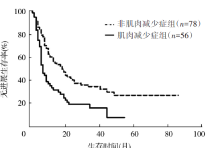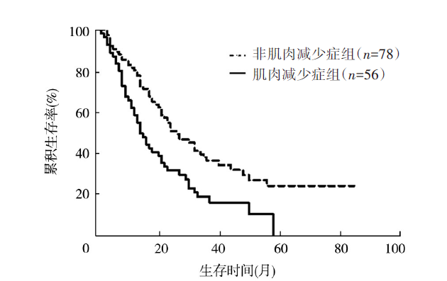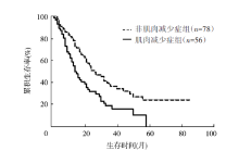 目的 探究肌肉减少症与接受根治性放疗的老年食管癌患者疗效及预后的关系。方法 回顾性分析2013年1月至2018年12月就诊于扬州大学附属医院放疗科进行根治性放疗的134例老年食管癌患者的临床病理资料。使用计算机断层扫描后的CT图像测量第3腰椎水平处的肌肉横截面积。根据放疗前骨骼肌指数将患者分为肌肉减少症组(n=56)和非肌肉减少症组(n=78)。比较两组患者的疗效及不良反应发生情况。采用Kaplan-Meier法绘制生存曲线,通过Cox回归模型分析预后影响因素。结果 肌肉减少症组患者和非肌肉减少症组患者在根治性放疗结束后1个月的客观缓解率分别为53.57%(30/56)、71.79%(56/78),差异有统计学意义(χ2=4.71,P=0.030)。两组的疾病控制率分别为94.64%(53/56)、91.03%(71/78),差异无统计学意义(χ2=0.21,P=0.651)。肌肉减少症组和非肌肉减少症组患者不良反应总发生率分别为67.86%(38/56)、47.44%(37/78),差异有统计学意义(χ2=5.52,P=0.019)。至随访结束,134例接受根治性放疗的老年食管癌患者1、3和5年生存率分别为91.0%、73.1%、55.2%。肌肉减少症组和非肌肉减少症组患者中位总生存期(OS)分别为14个月、26个月,差异有统计学意义(χ2=9.84,P=0.002);两组患者中位无进展生存期(PFS)分别为7个月、18个月,差异有统计学意义(χ2=9.91,P=0.002)。单因素分析显示,cT分期(HR=2.45,95%CI为1.26~4.74,P=0.008)、cN分期(HR=1.63,95%CI为1.06~2.50,P=0.027)、cTNM分期(HR=2.04,95%CI为1.28~3.27,P=0.003)、体质量指数(BMI)(HR=2.23,95%CI为1.01~4.90,P=0.046)、放疗前肌肉减少症(HR=2.45,95%CI为1.27~4.72,P=0.007)和化疗(HR=0.30,95%CI为0.11~0.83,P=0.020)是患者OS的预后影响因素;cT分期(HR=2.27,95%CI为1.18~4.39,P=0.015)、cN分期(HR=1.61,95%CI为1.04~2.47,P=0.030)、cTNM分期(HR=1.90,95%CI为1.19~3.02,P=0.007)、BMI(HR=1.98,95%CI为1.06~3.79,P=0.032)、放疗前肌肉减少症(HR=1.79,95%CI为1.06~3.04,P=0.031)和不良反应(HR=0.60,95%CI为0.38~0.97,P=0.037)是患者PFS的预后影响因素。多因素分析显示,放疗前肌肉减少症(HR=1.91,95%CI为1.22~3.00,P=0.005)是患者OS的独立预后因素;BMI(HR=1.80,95%CI为1.03~3.15,P=0.039)和放疗前肌肉减少症(HR=2.00,95%CI为1.27~3.14,P=0.003)是患者PFS的独立预后因素。结论 放疗前的肌肉减少症是接受根治性放疗老年食管癌患者评价预后的有效预测指标,发生肌肉减少症的患者从治疗中获益小。