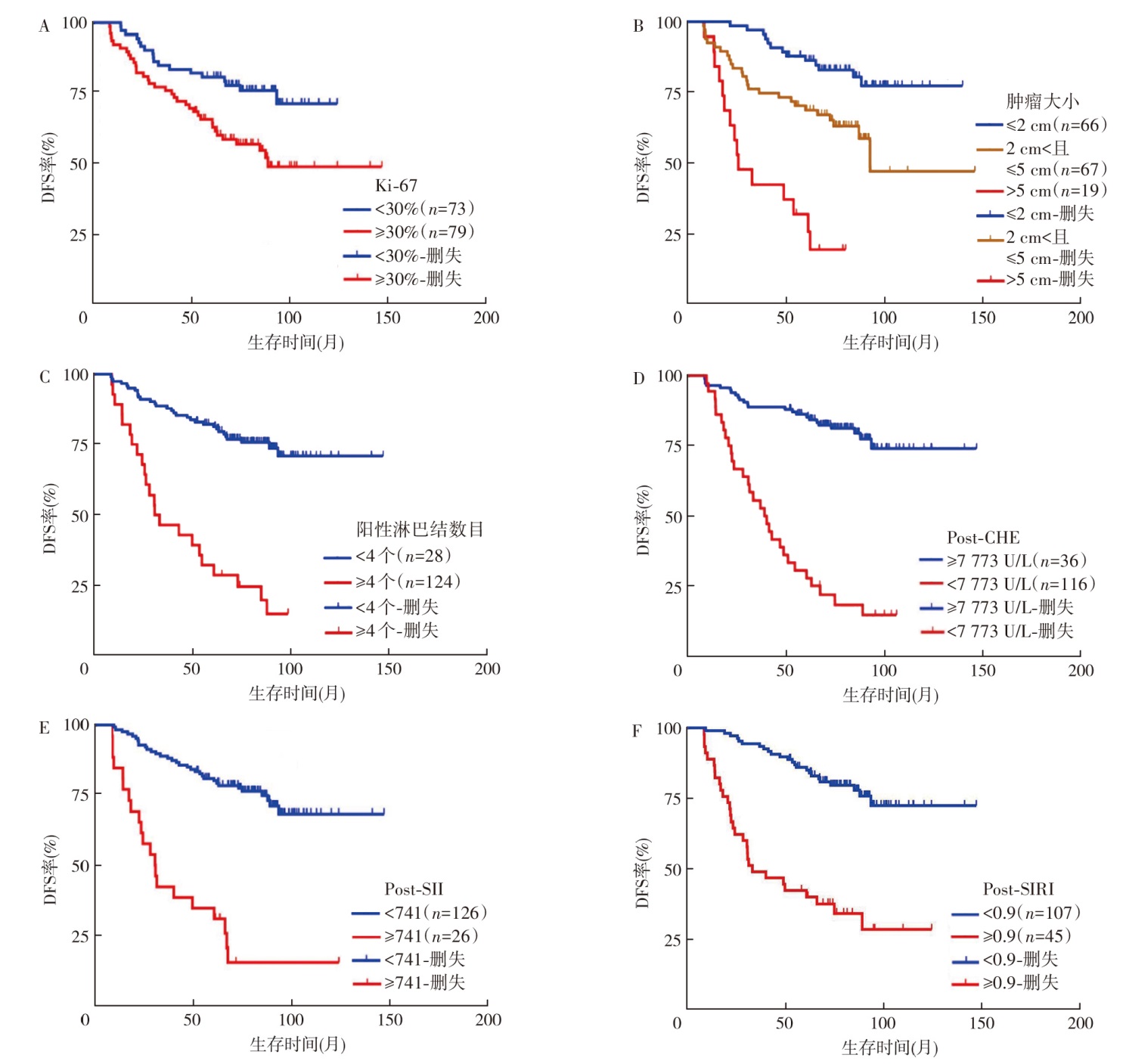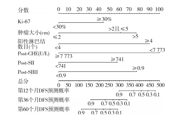 目的 分析接受手术治疗的ⅠA~ⅢA期乳腺癌患者术前、术后血清胆碱酯酶(CHE)水平, 探索其及外周血炎症指标在ⅠA~ⅢA期乳腺癌预后预测中的作用。方法 回顾性研究2012年1月至2017年12月在徐州医科大学附属淮安医院接受手术和术后辅助治疗的152例ⅠA~ⅢA期乳腺癌患者相关血液指标。使用X-tile 3.6.1软件计算血清CHE水平和外周血炎症指标[全身免疫炎症指数(SII)和全身炎症反应指数(SIRI)]的最佳截断值。根据最佳截断值将患者分为低值组和高值组。采用Kaplan-Meier曲线和Cox回归分析评估CHE及外周血炎症指标与无瘤生存期(DFS)的相关性。采用Spearman相关系数和Wilcoxon检验评估治疗前后CHE和炎症指标的相关性和变化。通过R软件构建基于独立预后因素的列线图预测模型, 并用Bootstrap法进行验证。结果 治疗前后患者的CHE水平分别为8 645.0(7 251.3, 10 229.3)、9 309.0(7 801.0, 10 835.3)U/L, 差异有统计学意义(Z=2.73, P=0.006)。与患者DFS相关的术后CHE(Post-CHE)、术后SII(Post-SII)和术后SIRI(Post-SIRI)的最佳截断值分别为7 773 U/L、741和0.9。单因素分析显示, 肿瘤大小(≤2 cm比>2 cm且≤5 cm:HR=2.55, 95%CI为1.30~4.99, P=0.006;≤2 cm比>5 cm:HR=8.95, 95%CI为4.15~19.32, P<0.001)、阳性淋巴结数目(HR=3.84, 95%CI为2.24~6.58, P<0.001)、临床分期(Ⅰ期比Ⅱ期:HR=1.52, 95%CI为0.68~3.39, P=0.309;Ⅰ期比Ⅲ期:HR=8.12, 95%CI为3.76~17.55, P<0.001)、Ki-67表达(HR=2.19, 95%CI为1.24~3.84, P=0.007)、是否放疗(HR=2.05, 95%CI为1.19~3.53, P=0.010)、Post-CHE(HR=6.81, 95%CI为3.94~11.76, P<0.001)、术前中性粒细胞/淋巴细胞比值(Pre-NLR)(HR=1.11, 95%CI为1.02~1.21, P=0.014)、Post-NLR(HR=5.23, 95%CI为2.78~9.85, P<0.001)、Pre-血小板/淋巴细胞比值(PLR)(HR=2.08, 95%CI为1.01~4.26, P=0.046)、Post-PLR(HR=7.11, 95%CI为3.78~13.37, P<0.001)、Pre-淋巴细胞/单核细胞比值(LMR)(HR=0.37, 95%CI为0.20~0.66, P<0.001)、Post-LMR(HR=0.23, 95%CI为0.13~0.41, P<0.001)、Pre-SII(HR=1.81, 95%CI为1.05~3.12, P=0.033)、Post-SII(HR=6.12, 95%CI为3.48~10.76, P<0.001)、Pre-SIRI(HR=2.12, 95%CI为1.24~3.63, P=0.006)、Post-SIRI(HR=4.93, 95%CI为2.87~8.48, P<0.001)与ⅠA~ⅢA期乳腺癌患者DFS相关。多因素分析显示, 肿瘤大小(≤2 cm比>2 cm且≤5 cm:HR=2.86, 95%CI为1.41~5.78, P=0.003;≤2 cm比>5 cm:HR=3.72, 95%CI为1.50~9.26, P=0.005)、阳性淋巴结数目(HR=4.66, 95%CI为2.28~9.54, P<0.001)、Ki-67表达(HR=2.13, 95%CI为1.15~3.94, P=0.016)、Post-CHE(HR=0.18, 95%CI为0.10~0.33, P<0.001)、Post-SII(HR=2.71, 95%CI为1.39~5.29, P=0.004)、Post-SIRI(HR=3.77, 95%CI为1.93~7.36, P<0.001)是ⅠA~ⅢA期乳腺癌患者DFS的独立影响因素。Kaplan-Meier生存曲线分析显示, Ki-67<30%组患者中位DFS未达到, Ki-67≥30%组的中位DFS为89.0个月, 3、5年DFS率分别为84.9 %比75.9%、80.8%比64.3%, 差异具有统计学意义(χ2=7.65, P=0.006);肿瘤大小≤2 cm组患者中位DFS未达到, 2 cm<肿瘤大小≤5 cm组中位DFS为93.5个月, 肿瘤大小>5 cm组中位DFS为26.3个月, 3、5年DFS率分别为95.5 %比74.6%比42.1%、86.3%比68.6%比25.3%, 差异具有统计学意义(χ2=40.46, P<0.001);阳性淋巴结数目<4个组患者中位DFS未达到, 阳性淋巴结数目≥4个组中位DFS为30.7个月, 3、5年DFS率分别为87.9%比46.4%、81.4%比28.6%, 差异具有统计学意义(χ2=47.34, P<0.001);Post-CHE<7 773U/L组患者中位DFS为47.3个月, Post-CHE≥7 773U/L组中位DFS未达到, 3、5年DFS率分别为52.8 %比88.6%、27.8%比81.2%, 差异具有统计学意义(χ2=62.17, P<0.001);Post-SII<741组患者中位DFS未达到, Post-SII≥741组中位DFS为30.5个月, 3、5年DFS率分别为88.1%比38.5%、80.1%比30.8%, 差异具有统计学意义(χ2=50.78, P<0.001);Post-SIRI<0.9组患者中位DFS未达到, Post-SIRI≥0.9组中位DFS为33.3个月, 3、5年DFS率分别为93.5 %比46.7%、84.9%比39.9%, 差异具有统计学意义(χ2=40.67, P<0.001)。Spearman相关性分析发现, Post-CHE与Post-SII无相关性(r=-0.111, P=0.175), Post-CHE与Post-SIRI呈负相关(r=-0.228, P=0.005)。治疗后CHE较术前升高, 且治疗后CHE升高组患者的中位DFS未达到, CHE降低组患者的中位DFS为61.8个月, 差异有统计学意义(χ2=25.67, P<0.001)。基于独立预后因素构建的列线图具有良好的预测性能, 一致性指数为0.893。结论 治疗后患者血清CHE水平显著升高, 术后血清CHE联合SII及SIRI可有效预测ⅠA~ⅢA期乳腺癌患者的DFS, 且治疗后CHE升高患者预后较好, 基于独立预后因素构建的列线图对乳腺癌患者的DFS具有良好的预测性能。