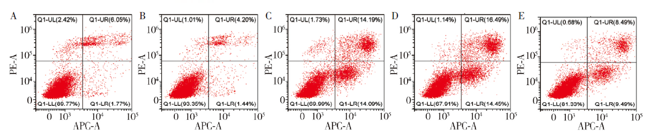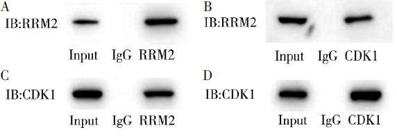 目的探究核糖核苷酸还原酶调节亚基M2(RRM2)通过调控周期蛋白依赖性激酶(CDK)1对胃癌细胞恶性生物学行为及有氧糖酵解的影响。方法将人胃癌MKN-45细胞分为si-NC组(转染空白片段)、CoCl2+si-NC组(低氧环境转染空白片段)、CoCl2+si-RRM2组(低氧环境沉默RRM2)、CoCl2+si-RRM2+pcDNA3.1 NC组(低氧环境沉默RRM2+空白载体)、CoCl2+si-RRM2+pcDNA3.1 CDK1组(低氧环境沉默RRM2+过表达CDK1)。实时荧光定量反转录PCR分析RRM2和CDK1 mRNA的相对表达量;免疫共沉淀分析RRM2和CDK1蛋白间的相互作用;MTT法检测细胞增殖活性;细胞划痕实验检测细胞迁移距离;流式细胞术检测细胞凋亡水平;三磷酸腺苷(ATP)和葡萄糖试剂盒检测ATP产生和葡萄糖消耗情况;蛋白质印迹法检测ENO1、RRM2、HK2、PKM2、GLUT1及p-CDK1/CDK1蛋白表达情况。结果实时荧光定量反转录PCR结果显示,si-NC组、CoCl2+si-NC组和CoCl2+si-RRM2组CDK1 mRNA相对表达量分别为1.01±0.15、1.30±0.06、0.51±0.18,RRM2 mRNA相对表达量分别为1.03±0.32、1.59±0.28、0.44±0.17,差异均有统计学意义(F=25.52,P=0.001;F=14.47,P=0.005);与si-NC组比较,CoCl2+si-NC组细胞RRM2和CDK1 mRNA表达均较高;与si-NC组、CoCl2+si-NC组比较,CoCl2+si-RRM2组细胞RRM2和CDK1 mRNA表达均较低(均P<0.05)。免疫共沉淀结果显示,RRM2与CDK1之间存在相互作用。MTT法、细胞划痕实验和流式细胞术结果显示,si-NC组、CoCl2+si-NC组、CoCl2+si-RRM2组、CoCl2+si-RRM2+pcDNA3.1 NC组和CoCl2+si-RRM2+pcDNA3.1 CDK1组细胞增殖活性分别为1.04±0.01、1.18±0.04、0.84±0.03、0.81±0.03、0.93±0.05,细胞迁移距离分别为(301.83±2.75)、(369.67±0.76)、(176.50±6.38)、(175.83±3.69)、(254.17±1.61)μm,细胞凋亡率分别为8.05%±0.21%、5.75%±0.20%、28.28%±0.04%、30.18%± 1.51%、17.79%±0.22%,差异均有统计学意义(F=73.82,P<0.001;F=1 600.01,P<0.001;F=787.15,P<0.001);与si-NC组和CoCl2+si-NC组比较,CoCl2+si-RRM2组、CoCl2+si-RRM2+pcDNA3.1 NC组和CoCl2+si-RRM2+pcDNA3.1 CDK1组细胞增殖、迁移能力较弱,细胞凋亡率较高(均P<0.05);与CoCl2+si-RRM2+pcDNA3.1 NC组比较,CoCl2+si-RRM2+pcDNA3.1 CDK1组细胞增殖、迁移能力较强,细胞凋亡率较低(均P<0.05)。ATP和葡萄糖检测结果显示,5组细胞ATP产生量和葡萄糖消耗量差异均有统计学意义(F=12.53,P<0.001;F=19.21,P<0.001);与si-NC组比较,CoCl2+si-RRM2+pcDNA3.1 CDK1组细胞葡萄糖消耗量较少(P<0.05);与CoCl2+si-NC组比较,CoCl2+si-RRM2+pcDNA3.1 CDK1组细胞ATP产生量和葡萄糖消耗量均较少(均P<0.05);与CoCl2+si-RRM2+pcDNA3.1 NC组比较,CoCl2+si-RRM2+pcDNA3.1 CDK1组细胞ATP产生量和葡萄糖消耗量均较多(均P<0.05)。蛋白质印迹法检测显示,5组细胞ENO1、RRM2、HK2、PKM2、GLUT1、p-CDK1/CDK1蛋白表达差异均有统计学意义(均P<0.001);与si-NC组和CoCl2+si-NC组比较,CoCl2+si-RRM2+pcDNA3.1 CDK1组细胞ENO1、RRM2、HK2、PKM2、GLUT1和p-CDK1/CDK1蛋白表达均较低(均P<0.05);与CoCl2+si-RRM2+pcDNA3.1 NC组比较,CoCl2+si-RRM2+pcDNA3.1 CDK1组细胞ENO1、RRM2、PKM2、GLUT1和p-CDK1/CDK1蛋白表达均较高(均P<0.05)。结论沉默RRM2可通过调控CDK1抑制胃癌细胞恶性生物学行为及有氧糖酵解的发生。