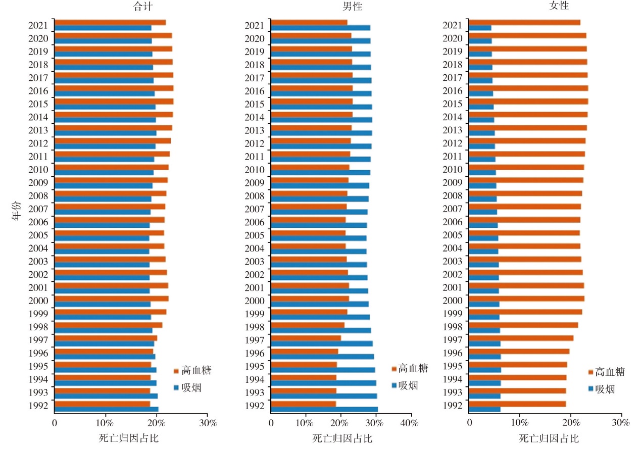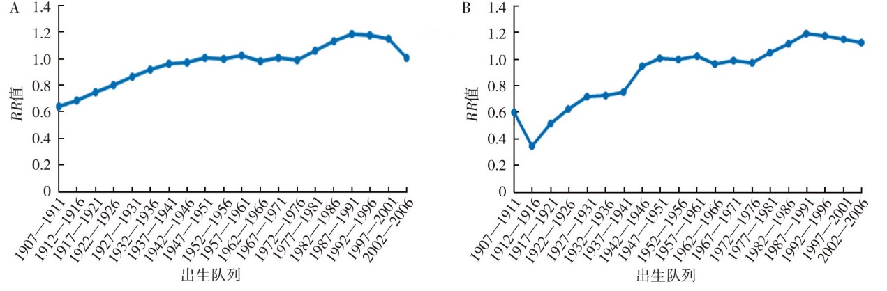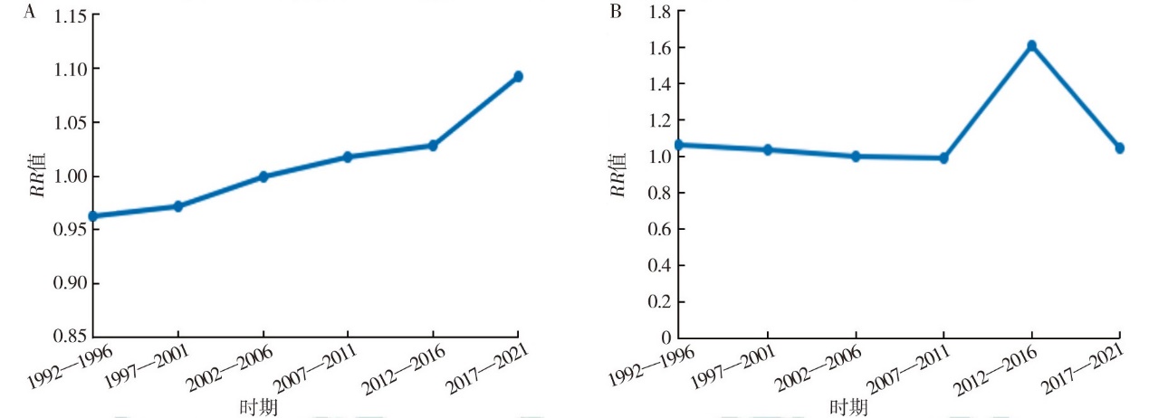 目的分析1992—2021年中国胰腺癌的发病和死亡情况,并探讨年龄、时期和队列对胰腺癌发病和死亡的影响。方法利用全球疾病负担研究(GBD)2021数据库,分析1992—2021年中国胰腺癌发病和死亡情况,应用Joinpoint软件分析标化发病率和标化死亡率的时间变化趋势,计算平均年度变化百分比。构建年龄-时期-队列模型,分析年龄、时期和出生队列对胰腺癌发病及死亡趋势变化的影响。分析胰腺癌死亡归因于高血糖和吸烟危险因素的疾病负担。结果2021年,中国胰腺癌发病率为8.34/10万,死亡率为8.41/10万,比1992年(3.33/10万和3.43/10万)分别升高了150.45%和145.19%。从性别看,2021年男性胰腺癌发病率(9.93/10万)和死亡率(9.91/10万)均高于女性(6.68/10万和6.83/10万)。1992—2021年,中国胰腺癌标化发病率和标化死亡率均有升高趋势,分别平均每年升高0.80%和0.62%,趋势均有统计学意义(均P<0.001)。年龄效应结果显示,中国胰腺癌的发病率总体呈升高趋势,15~49岁年龄组胰腺癌发病率呈平稳升高趋势,在50岁以后胰腺癌发病率呈明显升高趋势,85岁以上年龄组达到高峰,为68.64/10万;死亡率在15~79岁年龄组呈缓慢升高趋势,在80~84岁年龄组呈明显升高趋势并达到高峰,为196.51/10万。时期效应结果显示,中国胰腺癌发病率的时期变化RR值总体呈升高趋势,以2002—2006年为参考组(RR=1),2017—2021年发病风险最高,发病风险RR=1.09(95%CI为1.05~1.13,P=0.012);胰腺癌死亡率的时期变化RR值变化趋势呈波动性,以2002—2006年为参考组(RR=1),2012—2016年死亡风险最高,死亡风险RR=1.60(95%CI为1.07~2.38,P=0.021)。队列效应结果显示,中国胰腺癌发病和死亡风险均总体随年份的增加呈升高趋势,以1952—1956年出生队列为参考队列(RR=1),1987—1991年出生队列的发病和死亡风险均最高(RR=1.18,95%CI为0.99~1.40,P=0.032;RR=1.63,95%CI为0.12~11.53,P=0.042),1992—1996年出生队列以后均呈下降趋势。胰腺癌死亡归因于高血糖占比有升高趋势,归因于吸烟有降低趋势。结论1992—2021年,中国胰腺癌的标化发病率和标化死亡率均呈上升趋势,男性的发病率和死亡率均高于女性。年龄、时期和队列均对胰腺癌的发病和死亡趋势产生显著影响。胰腺癌死亡归因于高血糖的危险呈升高趋势。