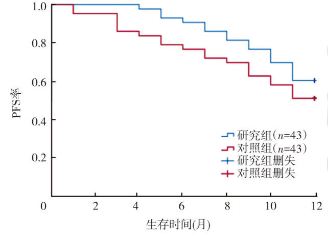 目的探究信迪利单抗联合多西他赛治疗宫颈癌的疗效及对实验室指标的影响。方法选取2019年7月至2022年6月在上海交通大学医学院附属新华医院治疗的86例晚期宫颈癌患者作为研究对象,按照治疗方法将患者分为研究组(n=43)和对照组(n=43)。研究组采用信迪利单抗联合多西他赛治疗,对照组采用多西他赛治疗。治疗6个周期后,比较两组临床疗效、血管内皮生长因子受体(VEGFR)水平、肿瘤标志物水平、免疫功能指标、程序性死亡受体1(PD-1)、程序性死亡受体配体1(PD-L1)水平以及治疗过程中的不良反应。比较两组患者1年无进展生存(PFS)率及总生存(OS)率。结果治疗6个周期后,研究组和对照组客观缓解率(ORR)分别为48.84%(21/43)、30.23%(13/43),差异无统计学意义(χ2=3.11,P=0.078);两组疾病控制率(DCR)分别为86.05%(37/43)、62.79%(27/43),差异有统计学意义(χ2=6.11,P=0.013)。治疗前研究组VEGFR2、VEGFR3水平分别为(223.42±57.89)、(3.25±1.22)ng/L,对照组分别为(220.56±58.45)、(3.31±1.17)ng/L,差异均无统计学意义(t=0.23,P=0.820;t=0.23,P=0.817);治疗后研究组VEGFR2、VEGFR3水平分别为(123.21±36.97)、(0.81±0.21)ng/L,对照组分别为(151.22±37.34)、(1.33±0.37)ng/L,差异均有统计学意义(t=3.50,P=0.001;t=8.02,P<0.001);两组患者治疗后VEGFR2、VEGFR3水平均较治疗前下降(均P<0.05)。治疗前研究组癌胚抗原(CEA)、糖类抗原125(CA125)、鳞状细胞癌抗原(SCC-Ag)水平分别为(8.73±1.02)ng/ml、(29.73±5.88)U/ml、(7.23±1.34)ng/ml,对照组分别为(8.41±1.23)ng/ml、(30.12±5.93)U/ml、(7.37±1.43)ng/ml,差异均无统计学意义(t=1.31,P=0.193;t=0.31,P=0.760;t=0.47,P=0.641);治疗后研究组CEA、CA125、SCC-Ag水平分别为(3.52±0.78)ng/ml、(13.28±1.82)U/ml、(2.33±0.49)ng/ml,对照组分别为(3.87±0.62)ng/ml、(14.12±1.72)U/ml、(2.65±0.54)ng/ml,差异均有统计学意义(t=2.30,P=0.024;t=2.20,P=0.031;t=2.88,P=0.005);两组患者治疗后CEA、CA125、SCC-Ag水平均较治疗前下降(均P<0.05)。治疗前研究组T细胞亚群CD4+、CD8+和CD4+/CD8+分别为(27.53±2.23)%、(29.34±3.78)%、0.93±0.33,对照组分别为(28.32±2.31)%、(30.03±3.27)%、0.94±0.42,差异均无统计学意义(t=1.61,P=0.110;t=0.91,P=0.368;t=0.12,P=0.903);治疗后研究组T细胞亚群CD4+、CD8+、CD4+/CD8+分别为(35.33±3.36)%、(44.32±4.33)%、0.80±0.22,对照组分别为(30.31±3.23)%、(42.21±4.31)%、0.71±0.19,差异均有统计学意义(t=7.06,P<0.001;t=2.27,P=0.026;t=2.03,P=0.046);两组治疗后T细胞亚群CD4+、CD8+均高于治疗前,而CD4+/CD8+低于治疗前(均P<0.05)。治疗前研究组PD-1、PD-L1 mRNA分别为1.21±0.21、0.73±0.15,对照组分别为1.23±0.25、0.79±0.14,差异均无统计学意义(t=0.40,P=0.689;t=1.92,P=0.059);治疗后研究组PD-1、PD-L1 mRNA分别为0.77±0.13、0.52±0.13,对照组分别为0.93±0.19、0.66±0.17,差异均有统计学意义(t=4.56,P<0.001;t=4.29,P<0.001);两组患者治疗后PD-1、PD-L1 mRNA水平均较治疗前下降(均P<0.05)。研究组患者1年PFS率、OS率分别为60.47%、72.09%;对照组分别为51.16%、65.12%,差异均无统计学意义(χ2=1.31,P=0.253;χ2=0.82,P=0.365)。研究组消化系统反应、肝肾功能异常、血尿、骨髓抑制、皮疹发生率分别为39.53%(17/43)、13.95%(6/43)、13.95%(6/43)、23.26%(10/43)、37.21%(16/43),对照组分别为32.56%(14/43)、9.30%(4/43)、11.63%(5/43)、18.60%(8/43)、30.23%(13/43),差异均无统计学意义(χ2=0.45,P=0.500;χ2=0.45,P=0.501;χ2=0.10,P=0.747;χ2=0.28,P=0.596;χ2=0.47,P=0.494)。结论与多西他赛单药治疗相比,信迪利单抗联合多西他赛治疗晚期宫颈癌的DCR高,一定程度上有效降低了VEGFR、血清肿瘤标志物和外周血单核淋巴细胞中PD-1、PD-L1水平,改善患者的免疫功能,药物安全性相当,但两种治疗方案患者1年生存率相当。
