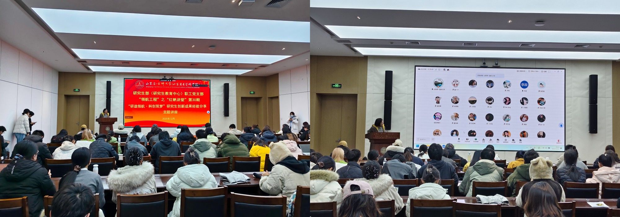 为深入推进“领航工程”,切实提升校(院)研究生科研创新能力,充分发挥优秀创新成果的示范引领作用,帮助广大研究生破解科研难题、拓宽学术视野、夯实创新根基,12月11日,研究生部(研究生教育中心)职工党支部“红帆讲堂”第30期以“研途领航・科创筑梦”为主题,成功举办研究生创新成果经验分享主题讲座。本期讲座以线上线下相结合的方式进行,特别邀请赵宏博、陈一文、宋旗、李政4位山东省研究生创新成果获得者登台分享。