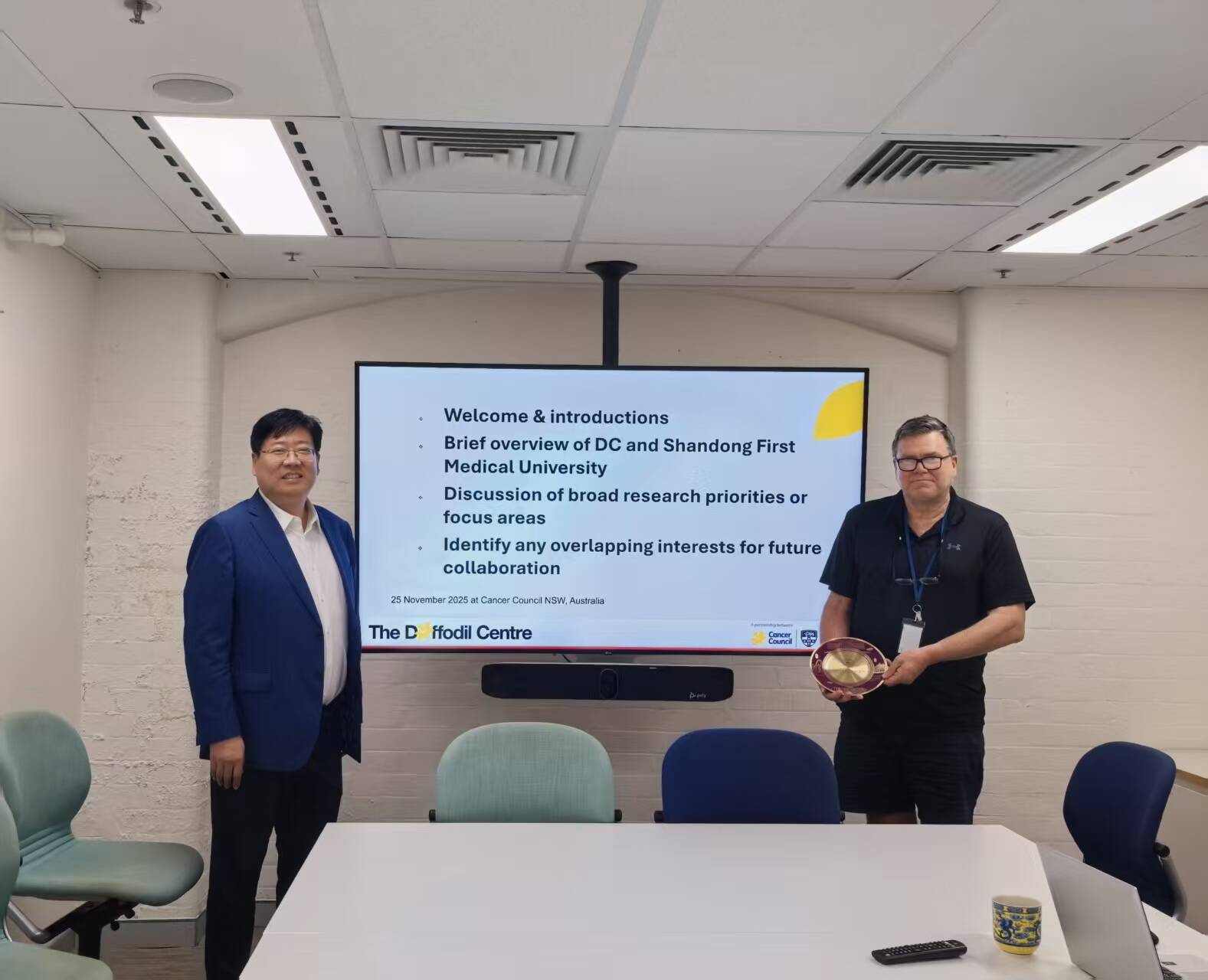 在悉尼大学戴夫迪尔研究中心,代表团与迈克尔・大卫教授、中国抗癌协会澳大利亚分会会长于学勤教授、克里斯蒂・麦克朗林博士围绕肿瘤防治、公共卫生等领域开展学术研讨,就研究生联合培养、临床实验数据分析共享、合作发表论文等方面达成合作共识。