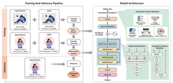 偏头痛(Migraine)是一类高度遗传性且全球范围内广泛存在的神经系统疾病,严重影响患者生活质量和社会负担。尽管早期 GWAS 在欧美人群中识别出多个风险基因,但传统分析方法受限于统计能力和复杂的遗传背景,难以充分捕获潜在的致病机制。针对这一难题,科研团队提出并构建了一种基于 Transformer 的深度学习框架,用于对 GWAS 数据进行综合建模和信号增强。