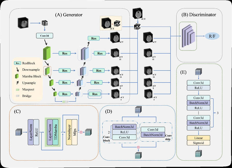 该研究创新性地提出了一种RC-MambaGAN模型,通过在编码器中融合Mamba模块与卷积神经网络(CNN)结构,有效实现了对全局与局部特征信息的协同捕捉。同时,研究引入差值约束策略,显著提升了合成CT(sCT)与真实CT之间的空间配准精度与结构一致性。经过多中心实验验证,RC-MambaGAN模型在多项关键评价指——包括平均绝对误差(MAE)、峰值信噪比(PSNR)、结构相似性指数(SSIM)和互信息(MI)等方面,均表现优异,超越了现有方法。所生成的sCT图像在解剖结构还原与剂量计算准确性方面均有显著提升,为磁共振引导放射治疗流程提供有力支持,展现出重要的临床应用潜力与推广价值。