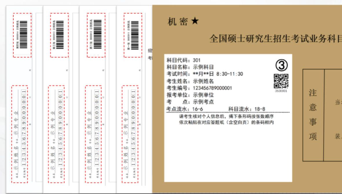 确认个人信息无误后,将试卷袋上的条形码,按照其编号顺序(“第一张”、“第二张”……),依次粘贴到对应序号的自命题答题纸的条码粘贴区域。若加页答题纸未预设条码粘贴区域,请参考其他答题纸条码粘贴区域,确保不越过装订线,不遮盖考生信息。