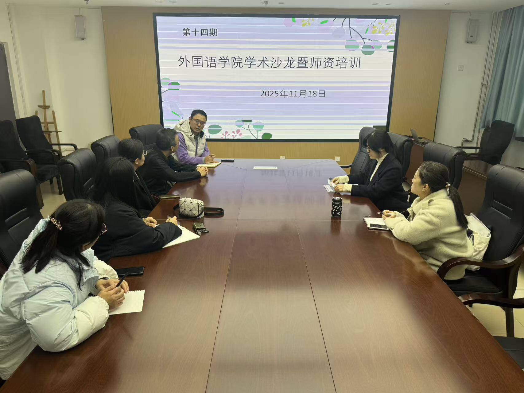 11月18日下午第十四期外国语学院学术沙龙暨师资培训在外国语学院会议室举行,活动由王双连副院长主持,多名教师线上线下参会。