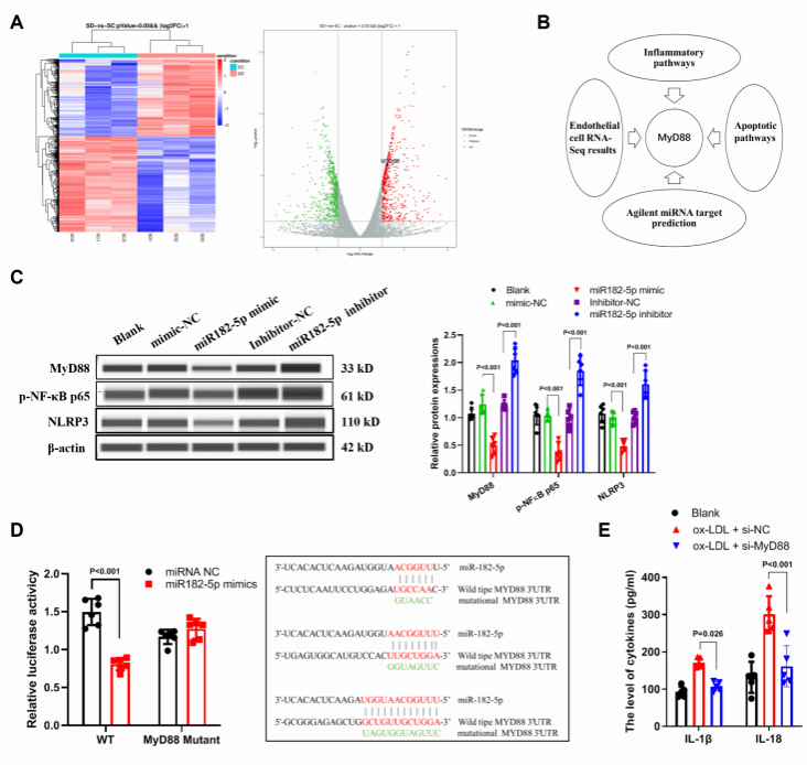 该文章继而探究了SD-exo的促炎作用成分,使用miRNA表达谱芯片分析了SD-exo和SC-exo之间差异表达的miRNAs。发现14个miRNAs中,miR-182-5p的下调会降低细胞活力,并发挥促凋亡和促炎的作用。因此,研究团队以miR-182-5p作为目标miRNA进行后续研究。通过RNA测序和miRNA数据库预测miR-182-5p的直接靶点为参与细胞凋亡和炎症反应的关键基因MYD88。转染miR-182-5p抑制剂的内皮细胞表现出MYD88蛋白水平显著上调的特征,同时p-NF-𝜅B和NLRP3的表达也升高,说明miR-182-5p通过靶向MYD88激活下游NF-𝜅B/NLRP3通路,发挥促炎作用。双荧光素酶报告实验也证实miR-182-5p可以与MYD88的3`UTR结合从而发挥作用。