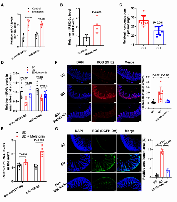 图3. 睡眠剥夺引起的褪黑素减少导致小肠上皮细胞中miR-182-5p表达下调