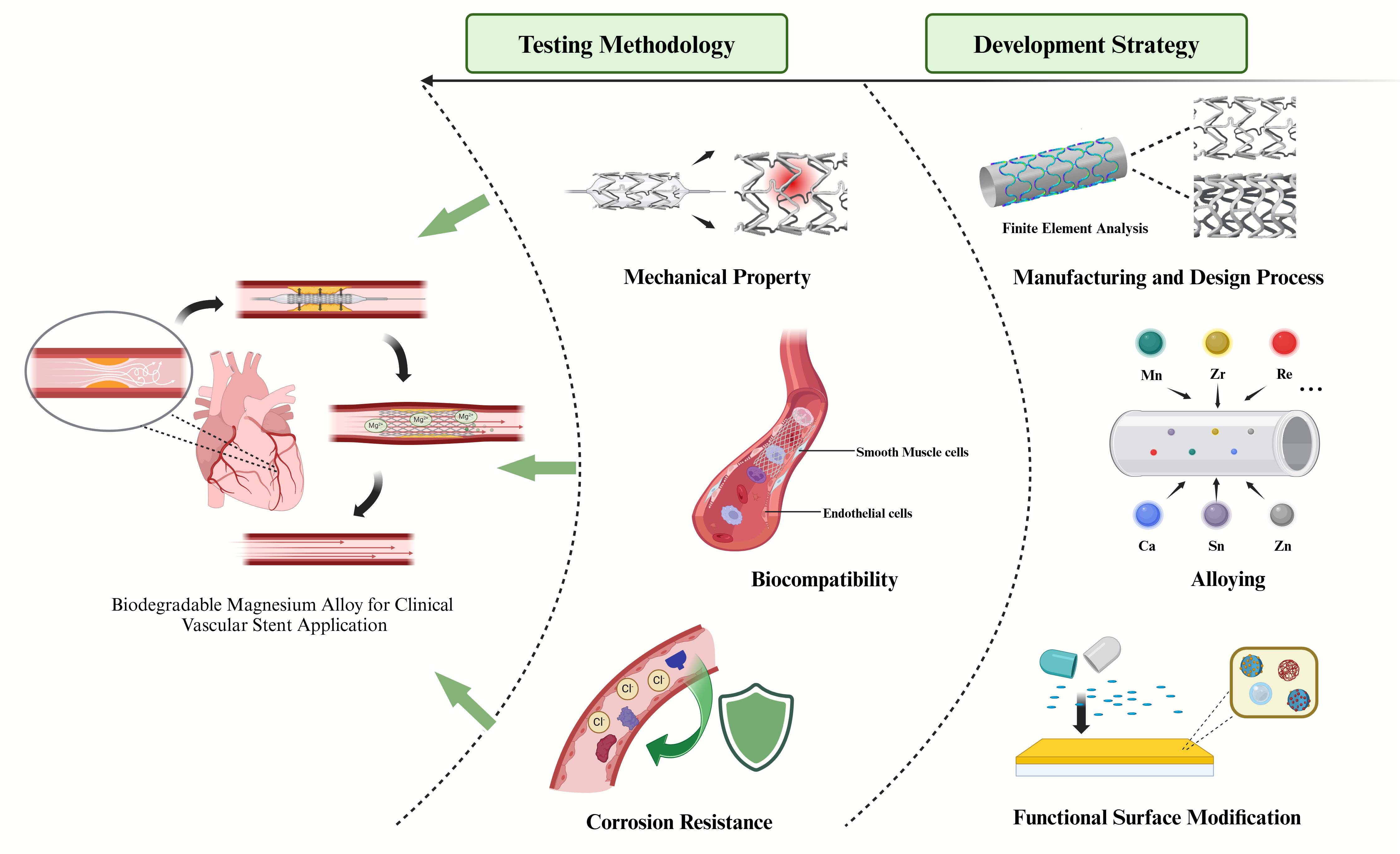 本研究聚焦于镁基可降解血管支架这一前沿热点,系统梳理了三大类体外评价方法:腐蚀性能测试、力学性能测试和生物相容性测试,重点强调了新型腐蚀反应器(微流控系统等)、虚拟测试的构建(有限元分析等)、先进生物检测方法在提升评估效率方面的价值。同时,总结了三大开发策略中的典型与创新:合金体系优化(Mg-Zn、Mg-RE等)、先进制造技术与结构优化、功能性表面改性(高分子、有机无机复合涂层等)。虽然取得了显著进步,但未来仍需解决测试方法标准化、支架降解速率可控性与力学支撑保持时间之间的协调以及长期生物安全性等难题。