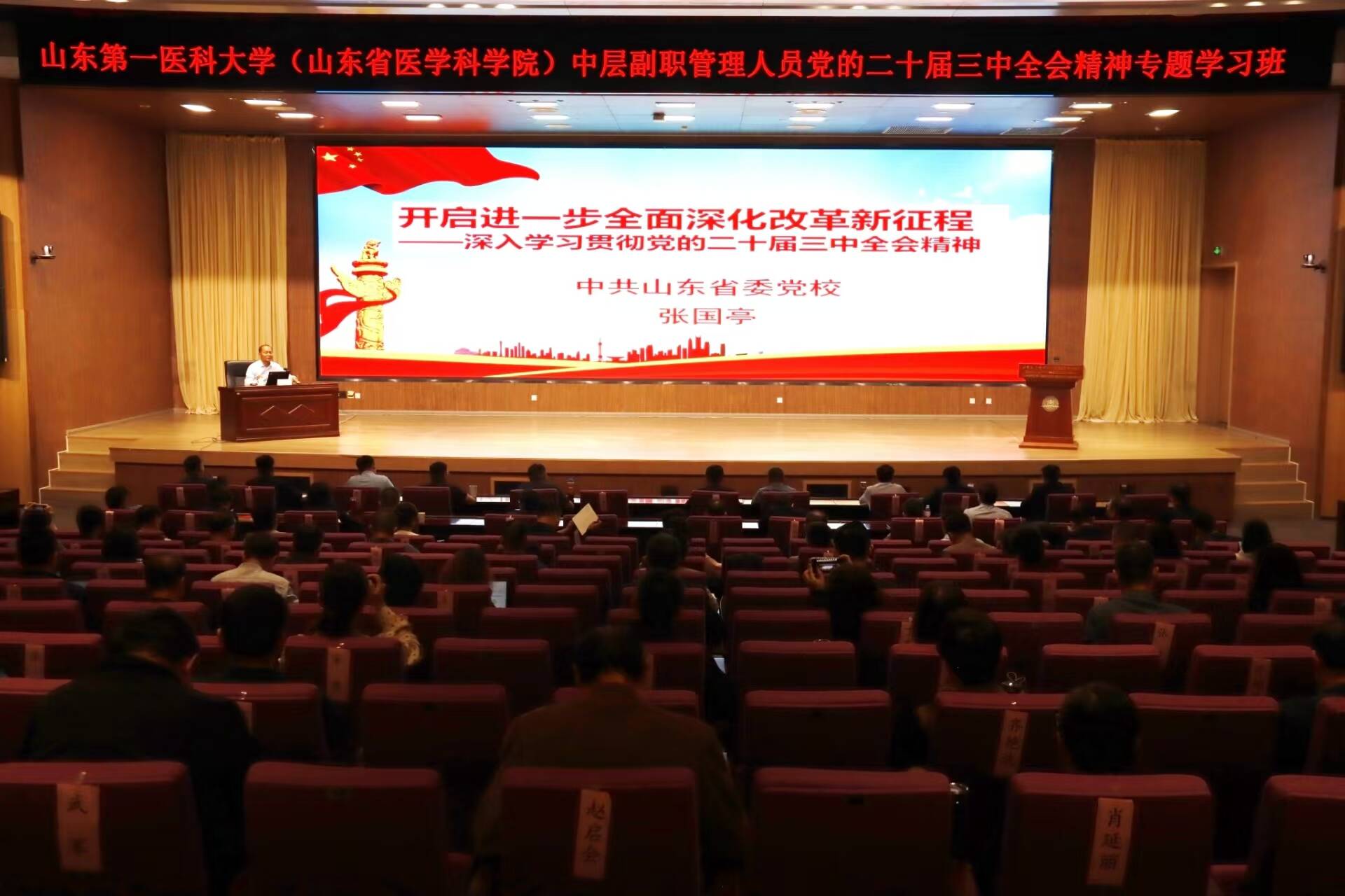 学习班邀请山东省委党校(山东行政学院)张国亭教授作“开启进一步全面深化改革新征程——深入学习贯彻党的二十届三中全会精神”专题辅导报告。报告紧紧围绕进一步全面深化改革,从“为什么、改什么、怎么改”三个方面,对全会精神进行了系统阐述和深刻解读。
