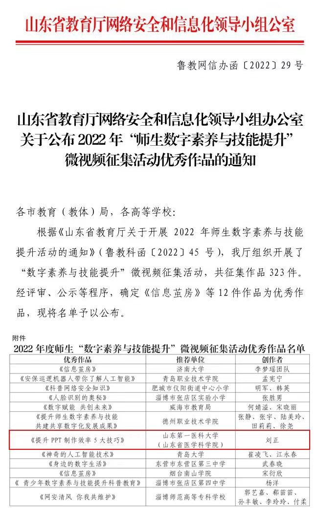 近日,山东省教育厅网络安全和信息化领导小组办公室公布了2022年“师生数字素养与技能提升”微视频征集活动获奖作品,校(院)选送的《提升PPT制作效率5大技巧》被评为优秀作品。