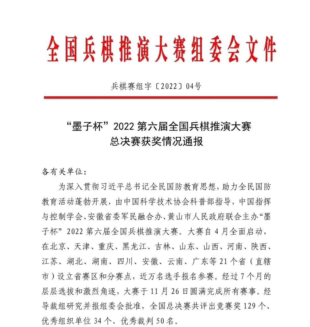 “墨子杯”第六届全国兵棋推演大赛由中国科学技术协会科普部指导,中国指挥与控制学会、安徽省委军民融合办、黄山市人民政府联合主办,旨在落实习近平总书记关于加强全民国防教育的重要指示精神,助力全民国防教育活动蓬勃开展。大赛自2022年4月全面启动,在北京、天津、重庆、山东等21个省(直辖市)设立省赛区和分赛点,近万名选手报名参赛。在省赛阶段,校(院)参赛队伍在600余支参赛队伍中以山东省第一名的优异成绩脱颖而出晋级全国总决赛。经过7个月的层层选拔和激烈角逐,大赛于11月26日圆满完成所有赛事。经导裁组研究并报组委会批准,全国总决赛共评出竞赛奖129个、优秀组织单位34个、优秀裁判50名。