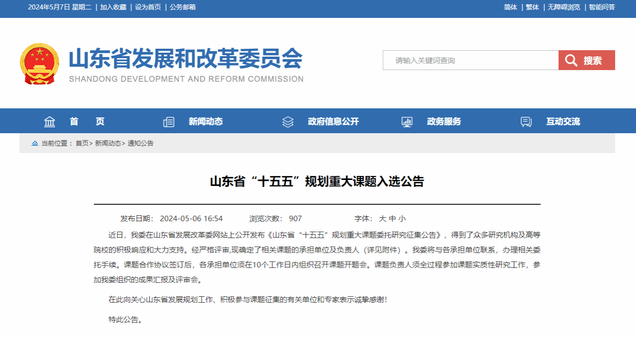山东省规划重大课题每五年征集一次,旨在为省政府制定“五年规划”重大战略出谋划策。“十五五”规划重大课题是为了深入贯彻落实习近平总书记对山东工作的重要指示要求,科学编制山东省“十五五”规划,前瞻性研究,遴选了22个事关山东中长期发展的重大战略问题面向社会公开征集,此次全省仅28个课题入选。