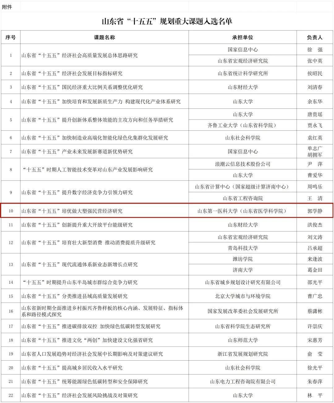 近日,山东省发展和改革委员会网站公开发布了《山东省“十五五”规划重大课题入选公告》,校(院)医药管理学院郭学静教授、陈海玉教授和附属省立医院张峰教授主持申报的“山东省‘十五五’培优做大塑强民营经济研究”课题获批立项。