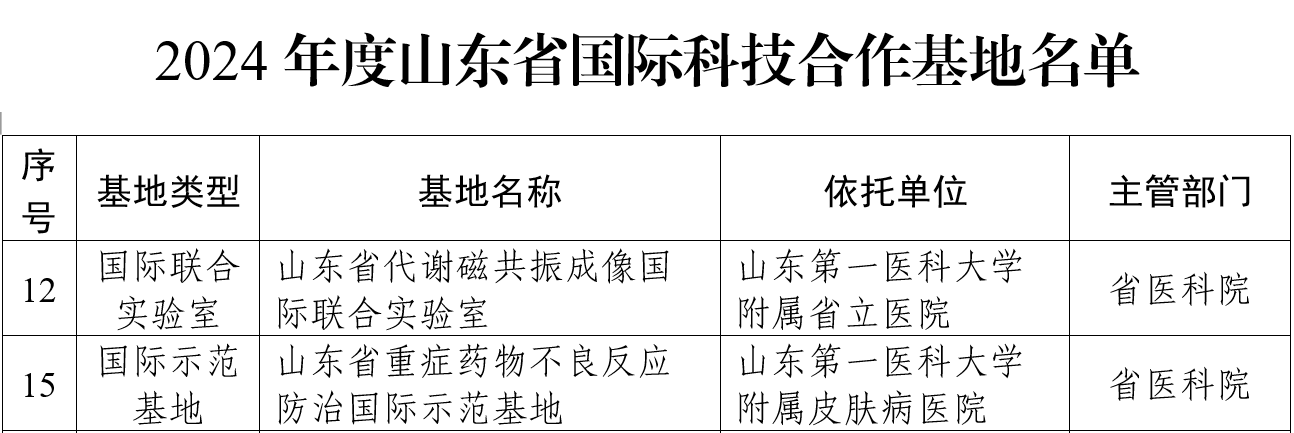 近日,山东省科学技术厅发布2024年度山东省国际科技合作基地认定名单,全省共遴选24个,校(院)山东省代谢磁共振成像国际联合实验室、山东省重症药物不良反应防治国际示范基地成功入选。