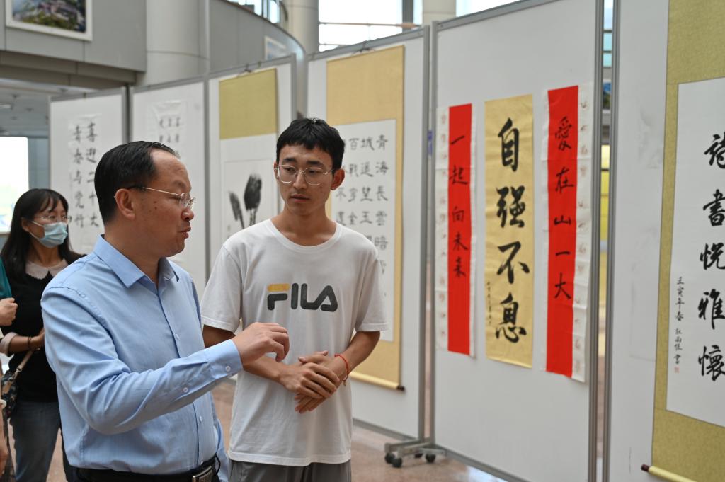 泰安长城路校区泰山图书馆二楼大厅,书画、剪纸等学生社团正开展“喜迎二十大 奋进新征程”主题活动,李栋来到活动现场,与社团成员亲切交谈,深入交流,详细了解社团发展状况,对学生社团发展给予科学指导。李栋鼓励同学们要结合校(院)特色,发挥好书画、剪纸等中国传统文化的作用,积极开展导向正确、健康向上、格调高雅、形式多样的社团活动,带动更多的同学参与其中,丰富校园生活,繁荣校园文化。