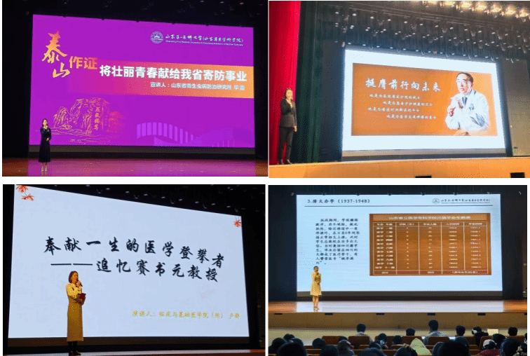 11月14日,青年讲师团“校史专题”宣讲报告会在济南校区举办。报告会上,山东省寄生虫病防治研究所的毕蕾、附属肿瘤医院党委办公室任秀、临床与基础医学院(所)卢静、校史馆王晓纯四位老师分别以尤家骏等老一辈防治专家、于金明院士、赛书元教授等山一大人的奋斗故事和校(院)发展历程中的典型事迹,带领同学们致敬榜样,汲取力量,激发青年学生砥砺奋进的强大动力。